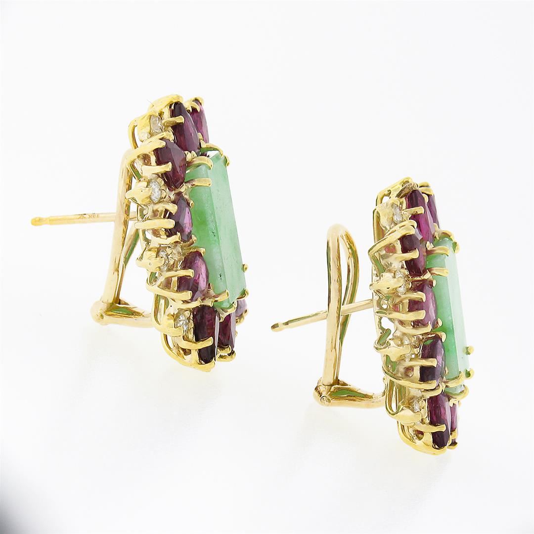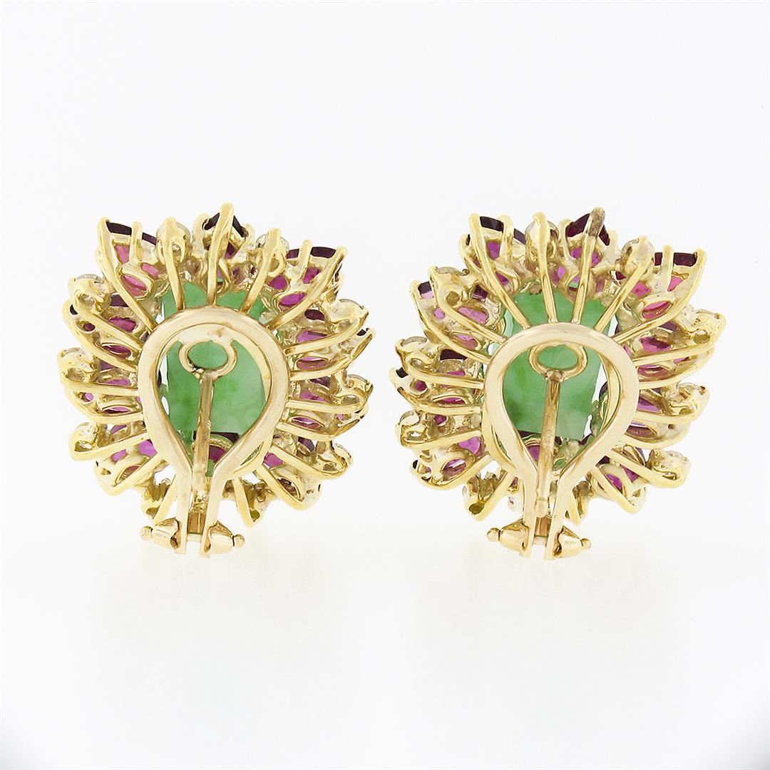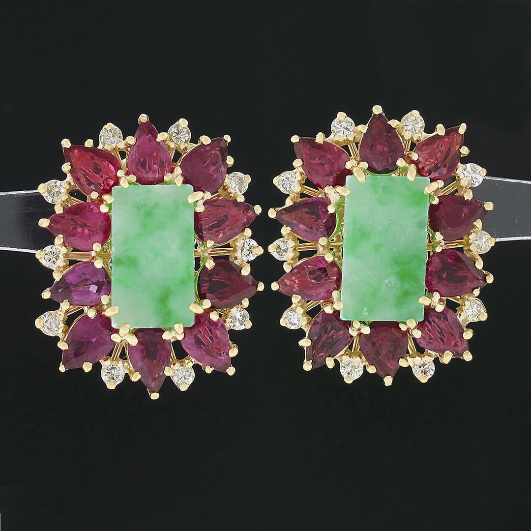 A vintage solid 18k yellow gold pair od earrings, featuring 2 rectangular cut natural jade (13.0x7.4mm each), surrounded with 20 pear cut natural rubies (8.0ctw ), and 20 round brilliant cut natural diamonds (I/J - SI1/SI2 ; 0.60ctw). The earrings measure approximately 25.90x20.80mm and weigh a total of 15.43 grams.