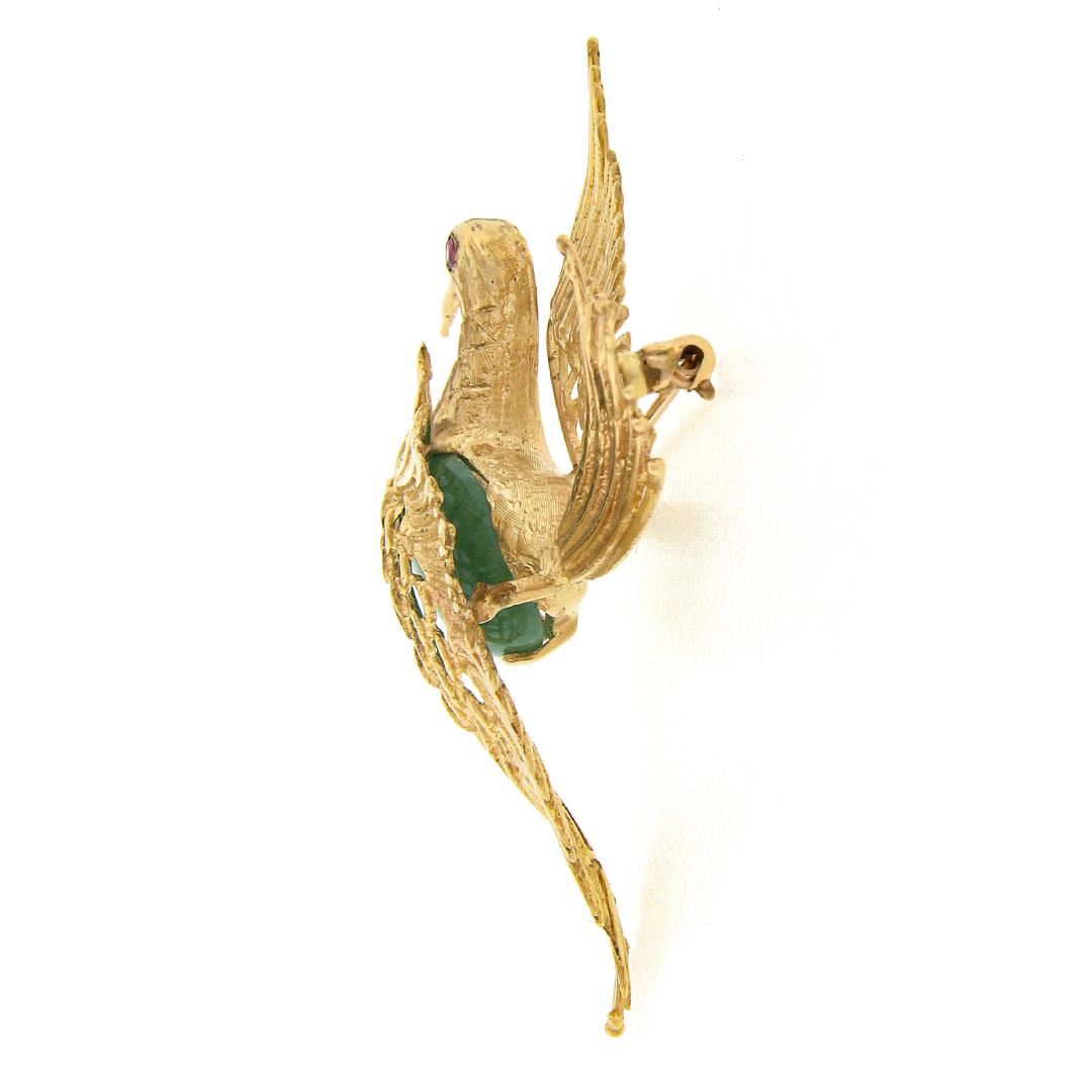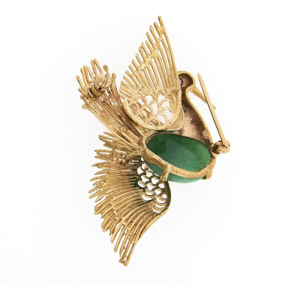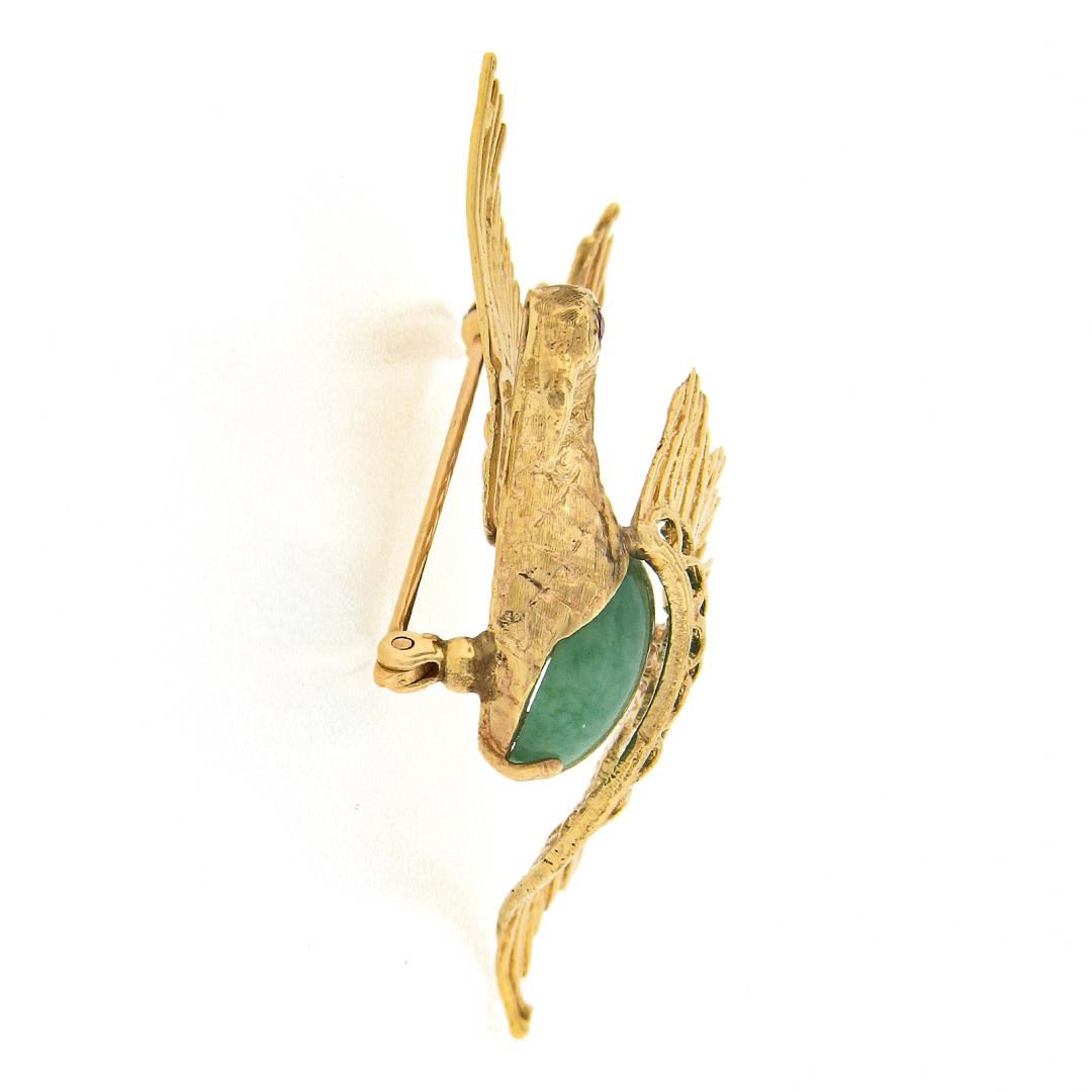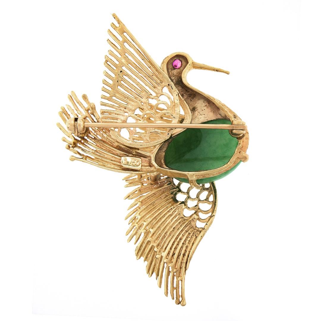 A vintage solid 18k yellow gold bird brooch, with 1 oval cabochon cut natural jade (15.5x12.2mm), and 1 round brilliant cut natural ruby (0.03ct). Measures 53x34.6mm and weighs a total of 9.96 grams.