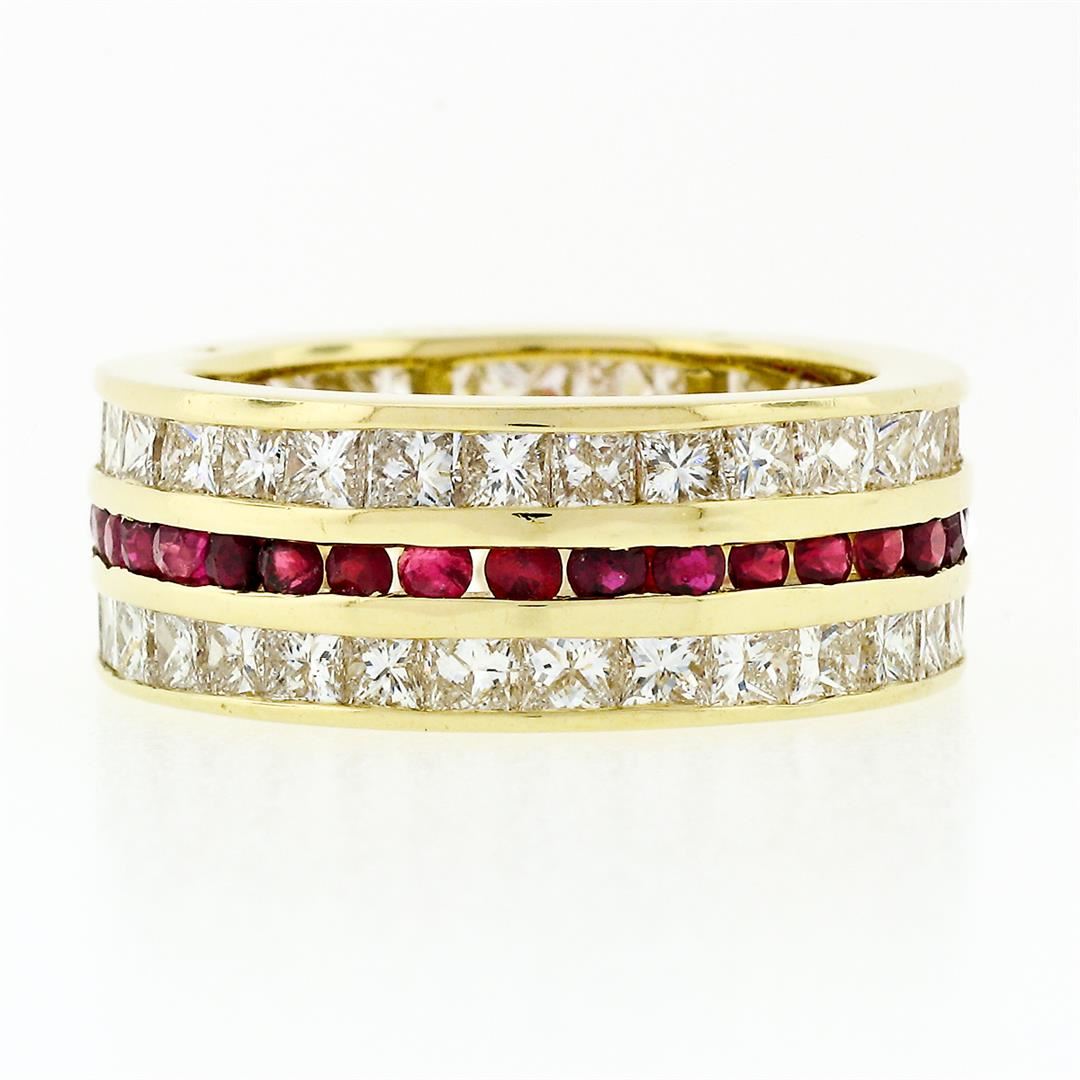 A solid 18k yellow gold eternity band ring, with 33 round brilliant cut natural rubies (1.0ctw), and 58 square princess cut natural diamonds (H/I C- VS1/VS2 ; 4.0ctw). The ring is size 6.0, weighs a total of 7.11 grams, and measures 7.7mm wide.