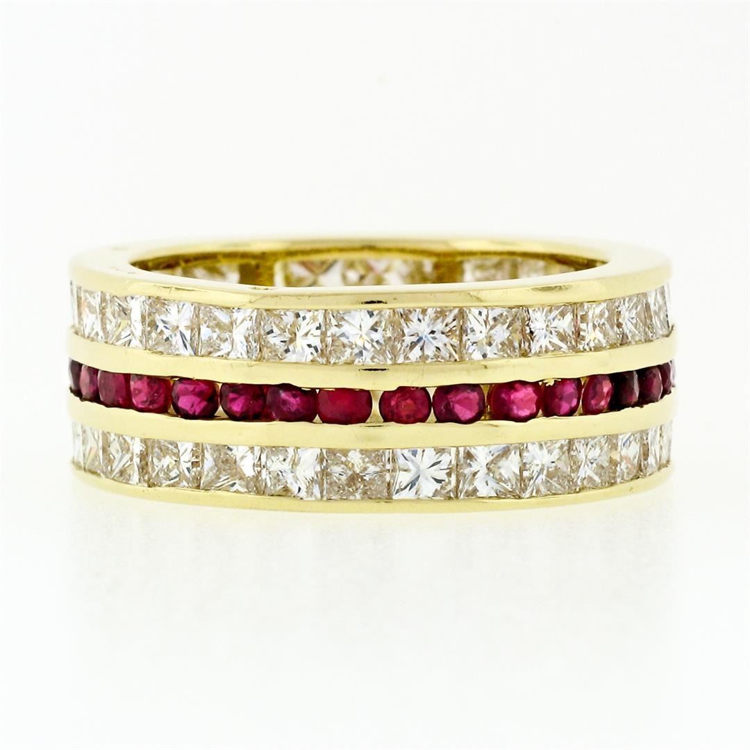 A solid 18k yellow gold eternity band ring, with 33 round brilliant cut natural rubies (1.0ctw), and 58 square princess cut natural diamonds (H/I C- VS1/VS2 ; 4.0ctw). The ring is size 6.0, weighs a total of 7.11 grams, and measures 7.7mm wide.