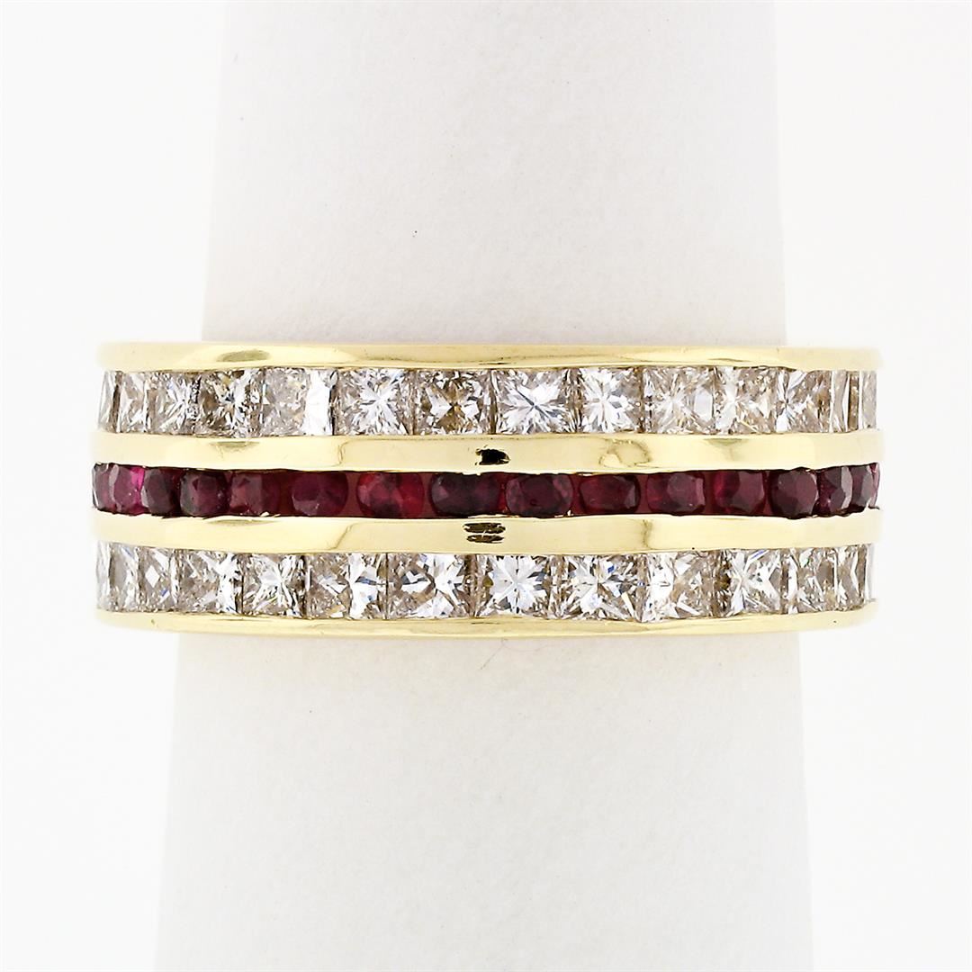 A solid 18k yellow gold eternity band ring, with 33 round brilliant cut natural rubies (1.0ctw), and 58 square princess cut natural diamonds (H/I C- VS1/VS2 ; 4.0ctw). The ring is size 6.0, weighs a total of 7.11 grams, and measures 7.7mm wide.