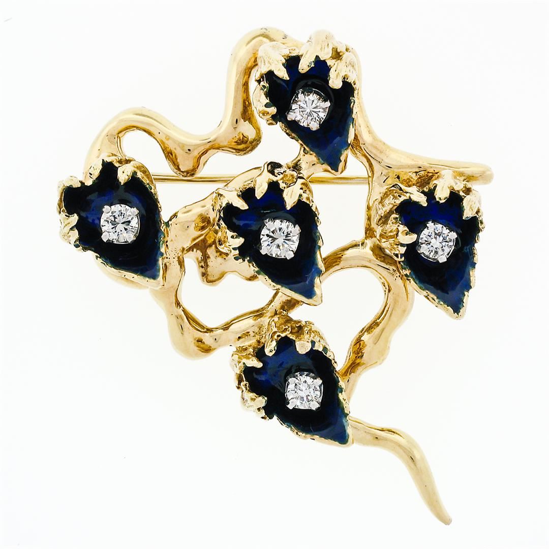 A vintage solid 18k yellow gold brooch pendant, with enamel work and 5 round brilliant cut natural diamonds (F/G- VS1; 0.53ctw). Measures 41.1x33mm and weighs a total of 18.39 grams.