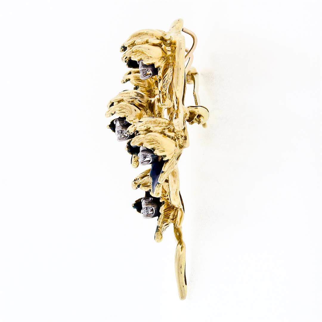 A vintage solid 18k yellow gold brooch pendant, with enamel work and 5 round brilliant cut natural diamonds (F/G- VS1; 0.53ctw). Measures 41.1x33mm and weighs a total of 18.39 grams.
