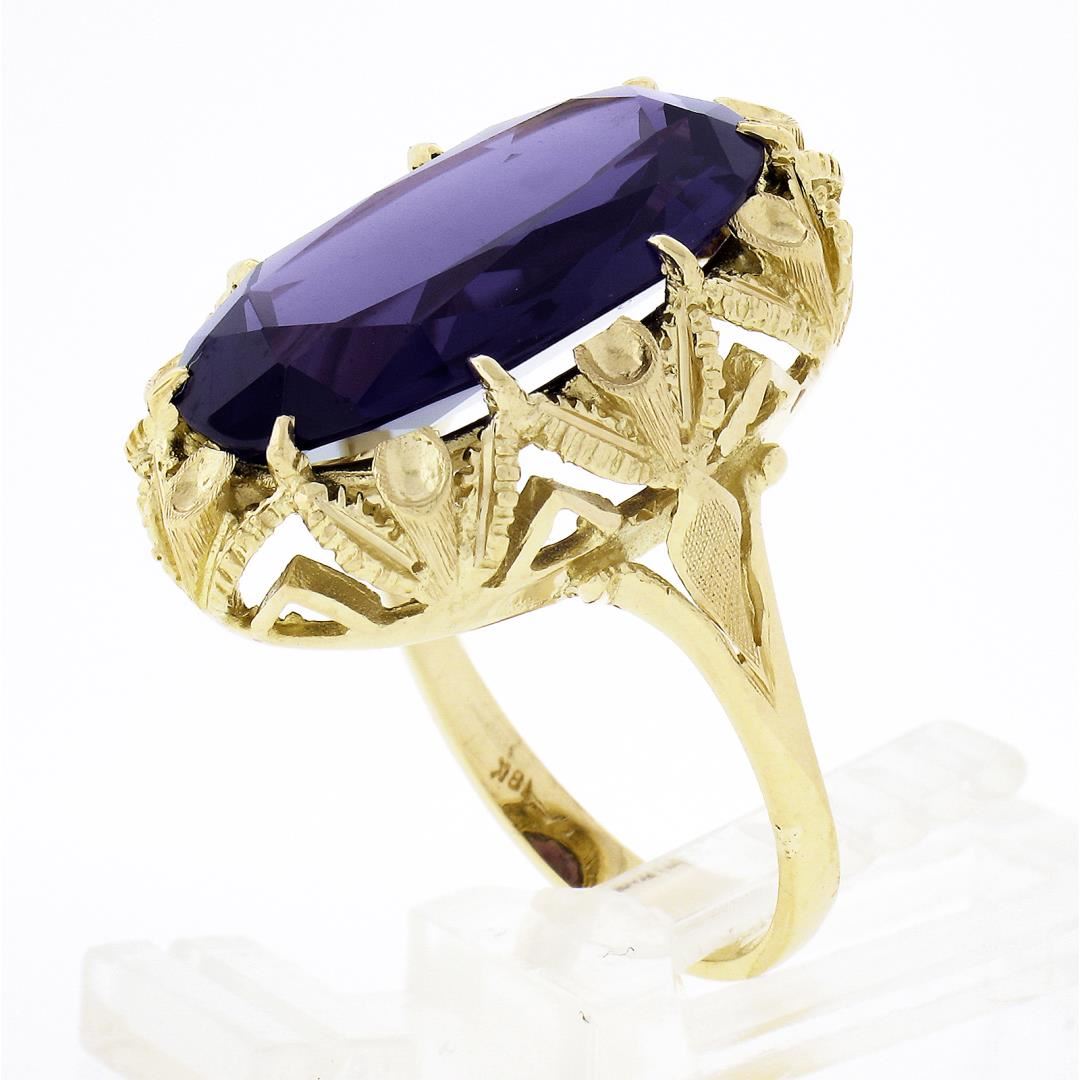 A vintage solid 18k yellow gold textured solitaire ring, with 1 oval cut synthetic alexandrite (20x12.1mm). The ring is size 8.0, weighs a total of 9.78 grams, and measures 24.70mm wide.