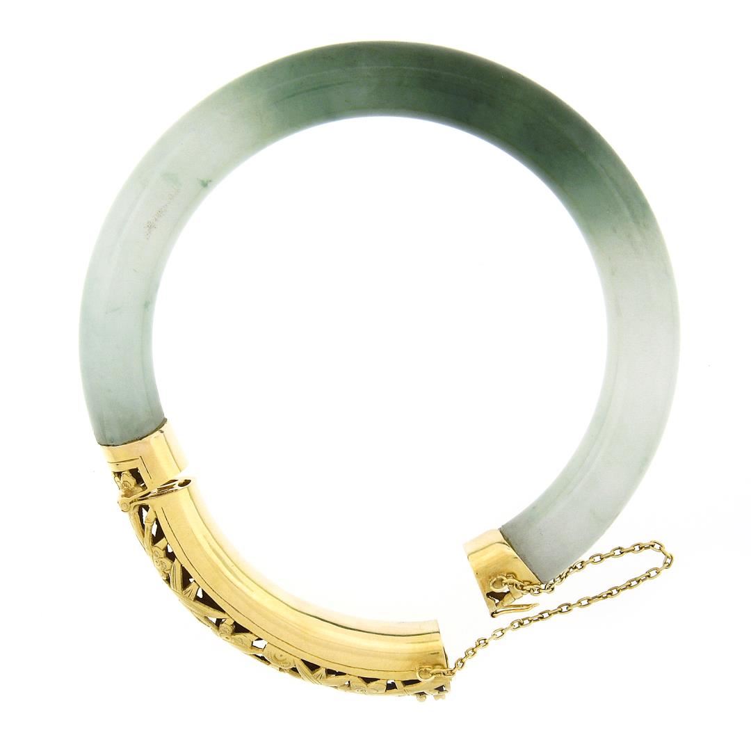A vintage solid 18k yellow gold bangle bracelet, with GIA graded 1 arc shape green & white natural jade (75.76x9.34mm). It weighs a total of 41.55 grams, measures 9.34mm wide, and measures 7 inches in length. Comes with all original relevant certifications.