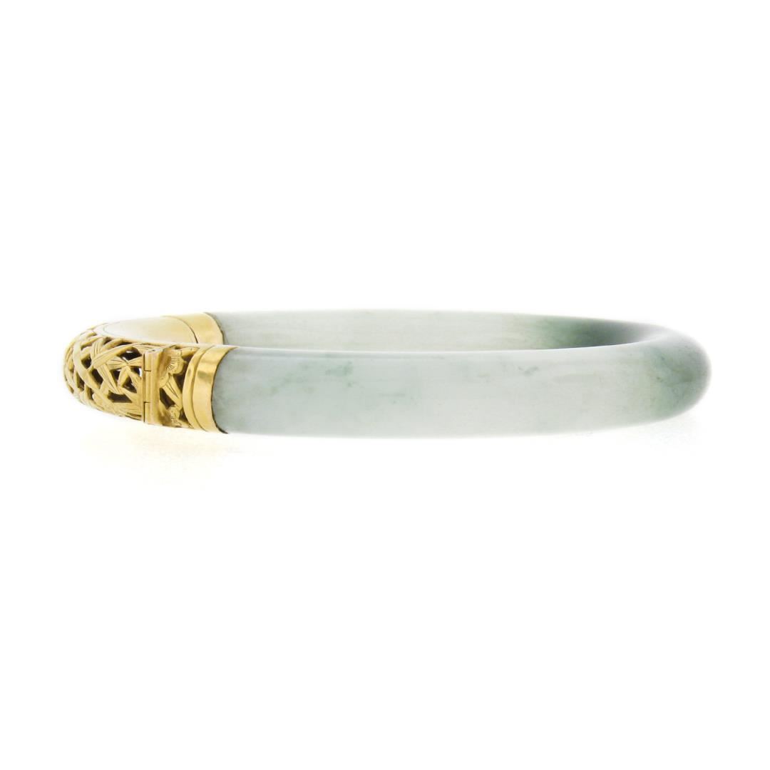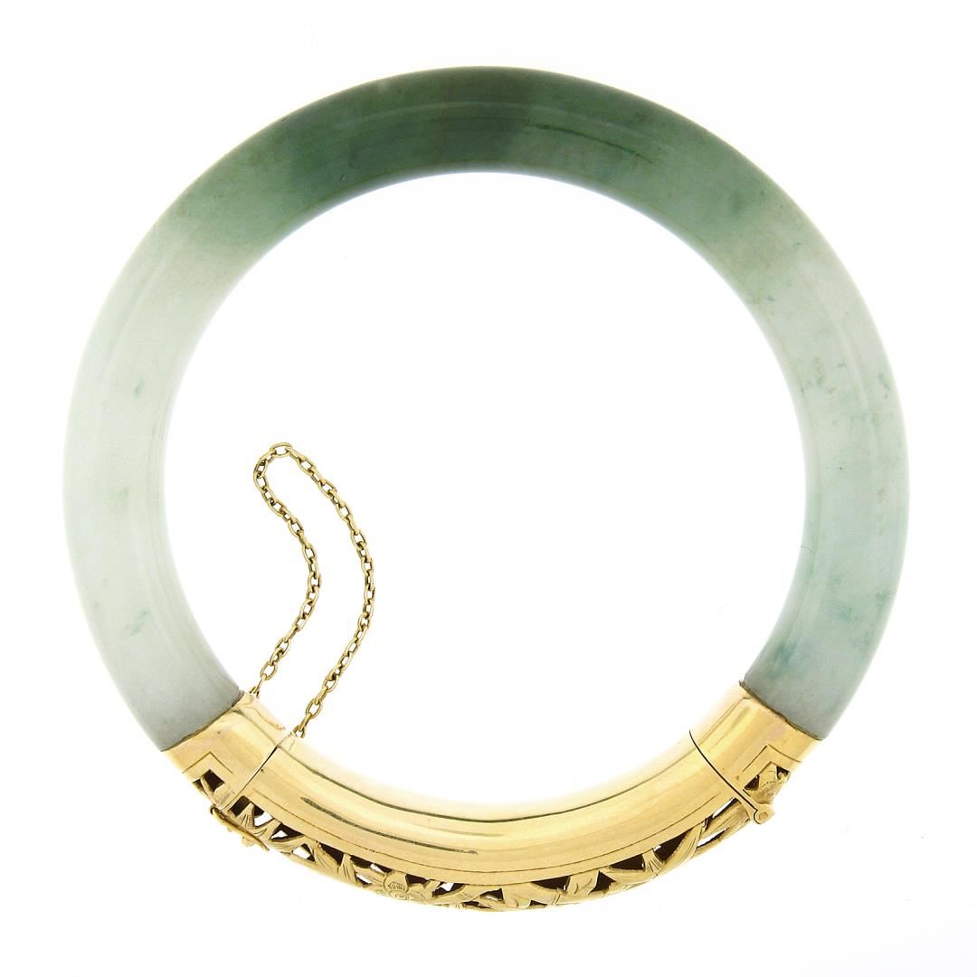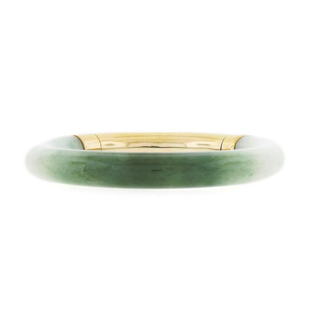 A vintage solid 18k yellow gold bangle bracelet, with GIA graded 1 arc shape green & white natural jade (75.76x9.34mm). It weighs a total of 41.55 grams, measures 9.34mm wide, and measures 7 inches in length. Comes with all original relevant certifications.