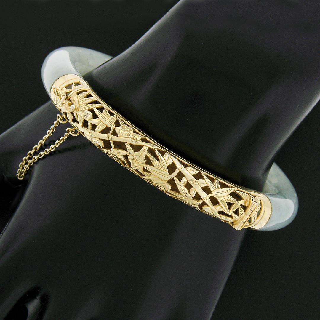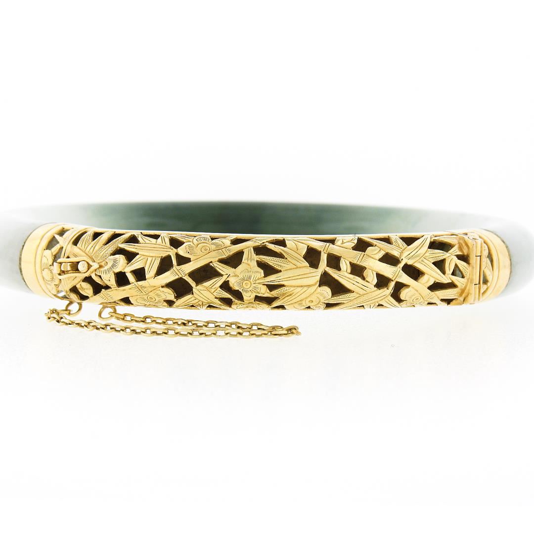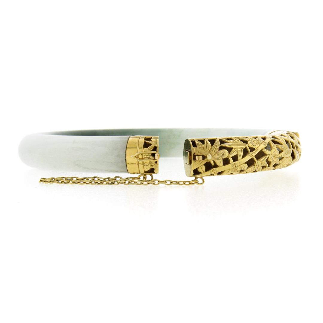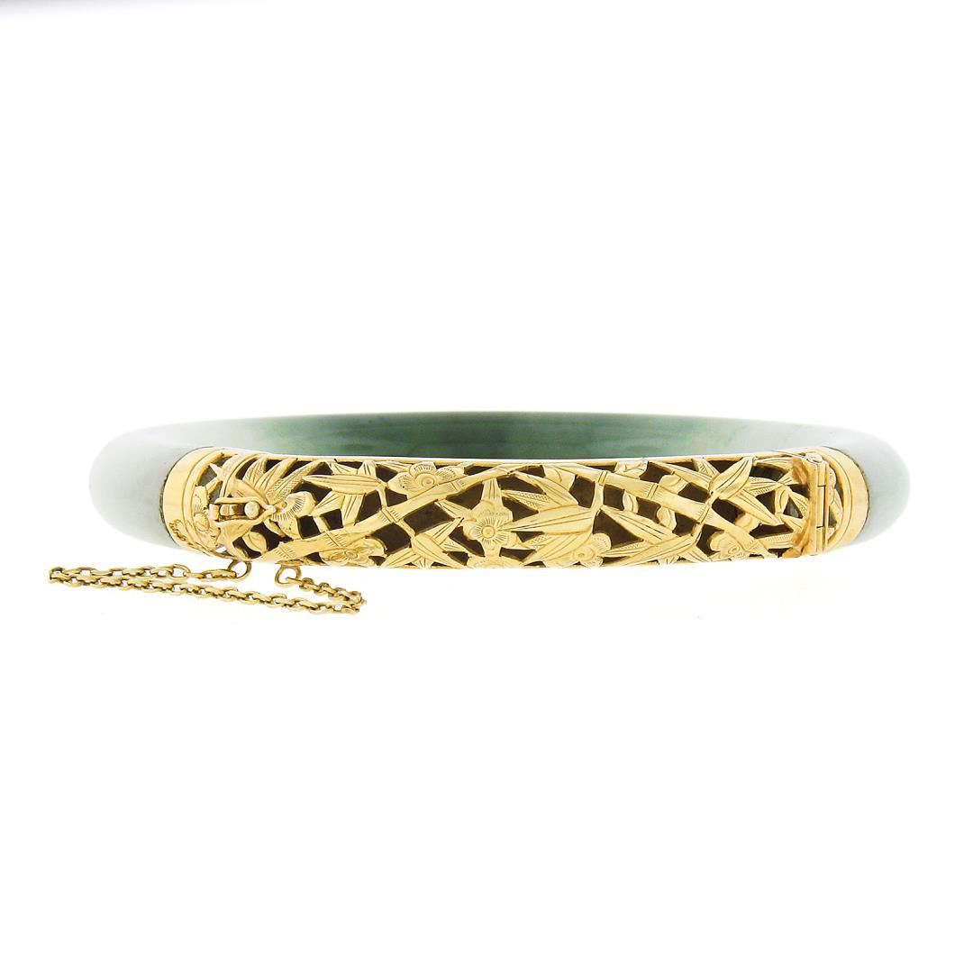 A vintage solid 18k yellow gold bangle bracelet, with GIA graded 1 arc shape green & white natural jade (75.76x9.34mm). It weighs a total of 41.55 grams, measures 9.34mm wide, and measures 7 inches in length. Comes with all original relevant certifications.