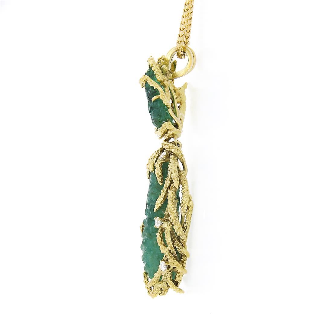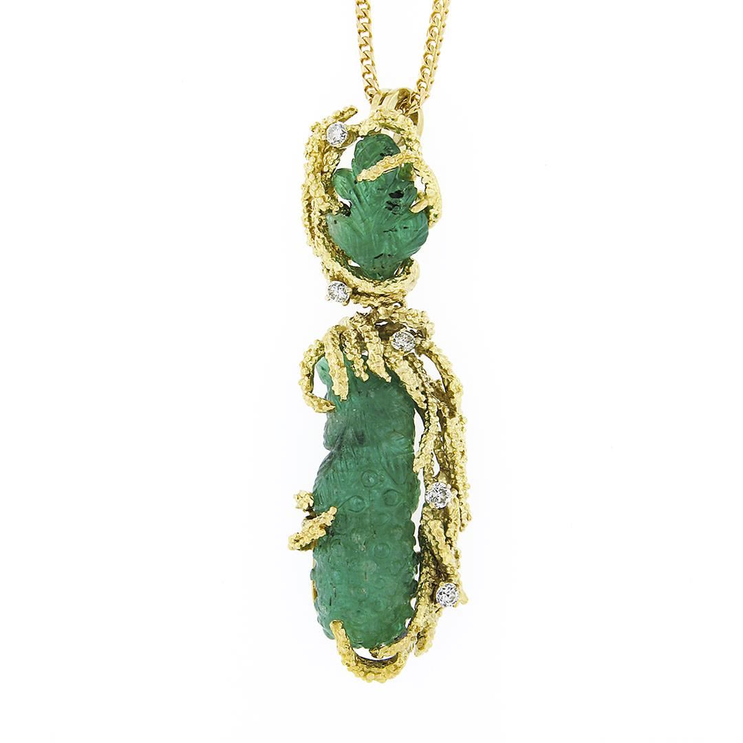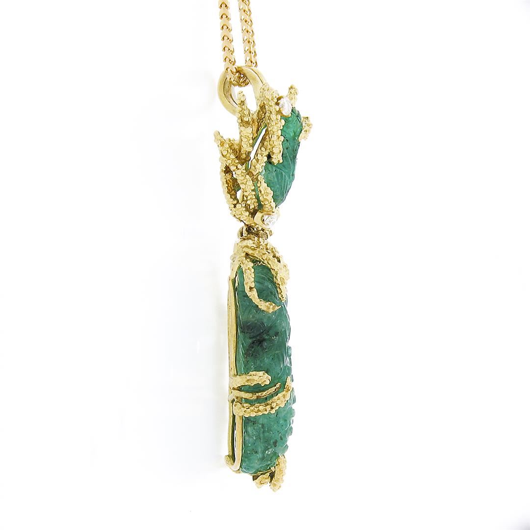 A vintage solid 18k yellow gold pendant necklace. with 1 gia certified carved natural emerald (28.85x9.95x7.85mm), 1 leaf carving natural emerald (13.6x10.0mm). with 5 round brilliant cut natural diamonds (F/G - VS1 ; 0.25ctw). 18 inch franco link chain, 21.56 grams total weight, pendant measures 57.60x15.2mm. Comes with all original relevant certifications.