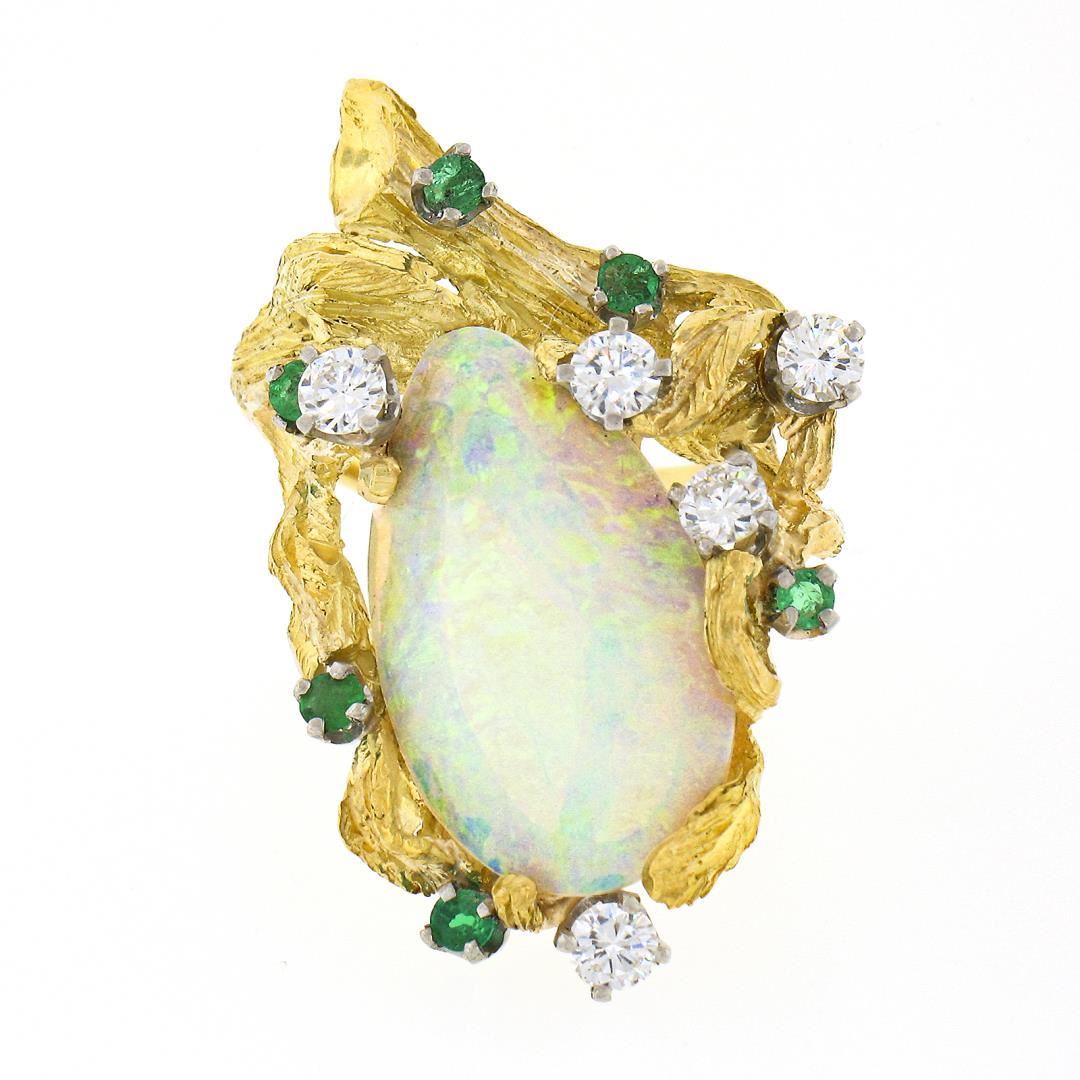 A vintage 18k yellow gold cocktail ring, with 1 GIA graded pear cabochon cut natural opal ( 20.03x11.4mm ), and 5 round brilliant cut natural diamonds (E/F - VS1 ; 0.60ctw), with 5 round brilliant cut natural emeralds (0.22ctw). The ring is size 6.0, weighs a total of 12.76 grams, and measures 34.30mm wide.Comes with all original relevant certifications.