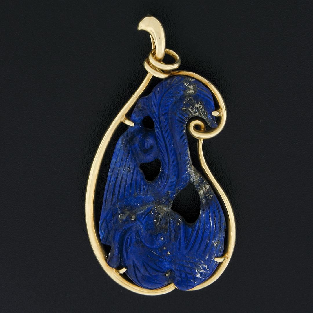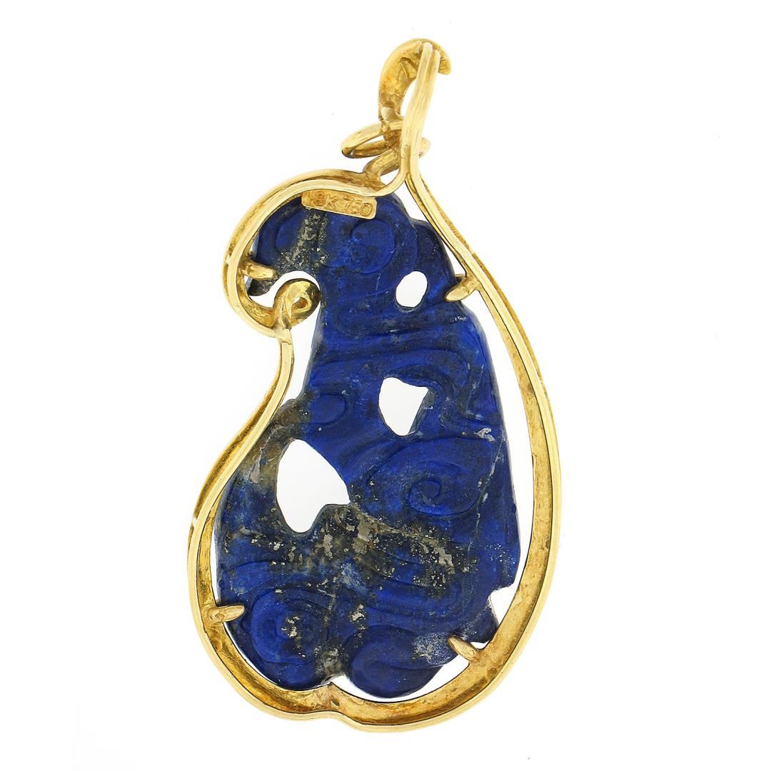 A vintage solid 18k yellow gold pendant, with 1 carved pierced custom cut natural lapis lazuli (44.5x25.4mm). The pendant weighs a total of 14.14 grams, measures 57x30.20mm including the bail, and the inside of the bail measures 6.5x5.7mm.
