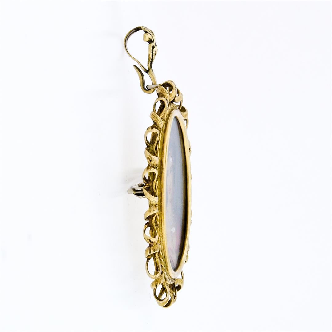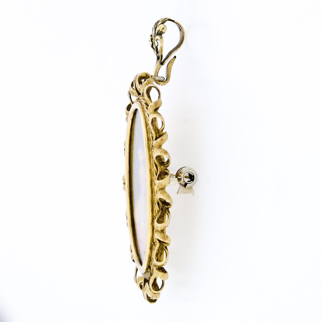 A vintage solid 18k yellow gold hand painted brooch pendant, with 2 single cut natural diamonds (G/H - VS2 ; 0.03ctw). Measures 55.65x37.9mm and weighs a total of 12.71 grams.