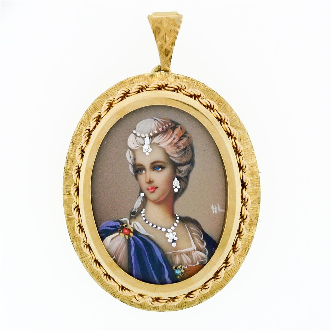 A vintage solid 18k yellow gold pendant with a hand painted portrait accented with 3 round single cut natural diamonds (F - VS1; 0.03ctw), all surrounded by a twisted rope and florentine finished frame. The pendant weighs a total of 12.44 grams, measures 49.1x31.8mm including the bail, and the inside of the bail Measures 6.9x3.15mm.
