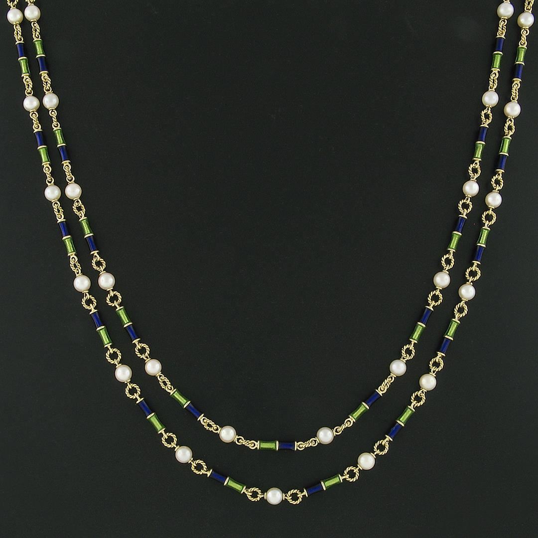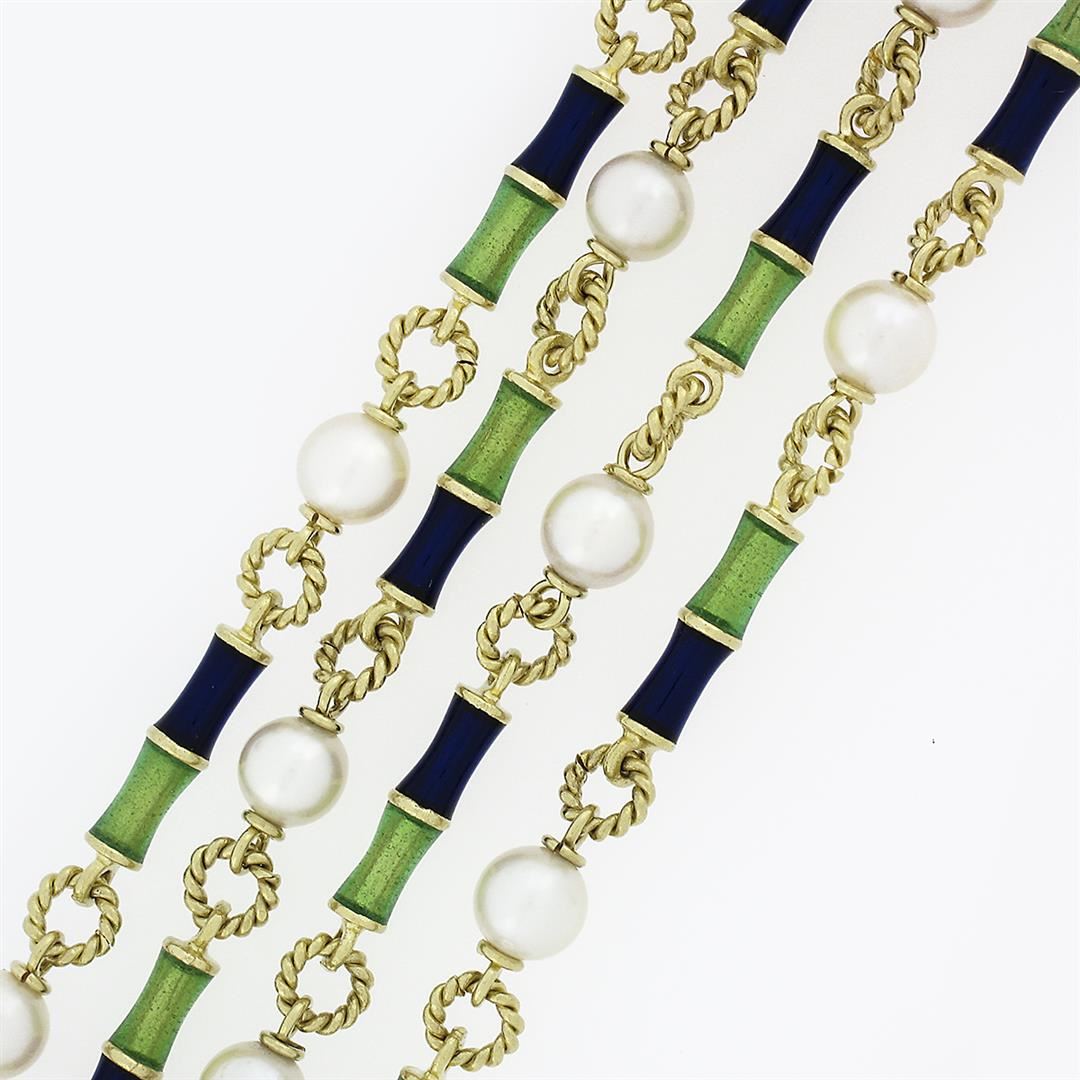 A vintage solid 18k yellow gold by the yard necklace, featuring enamel work and 33 round bead shape cultured pearls (5-5.1mm ). 40 inch twisted wire link chain, 37.52 grams total weight.