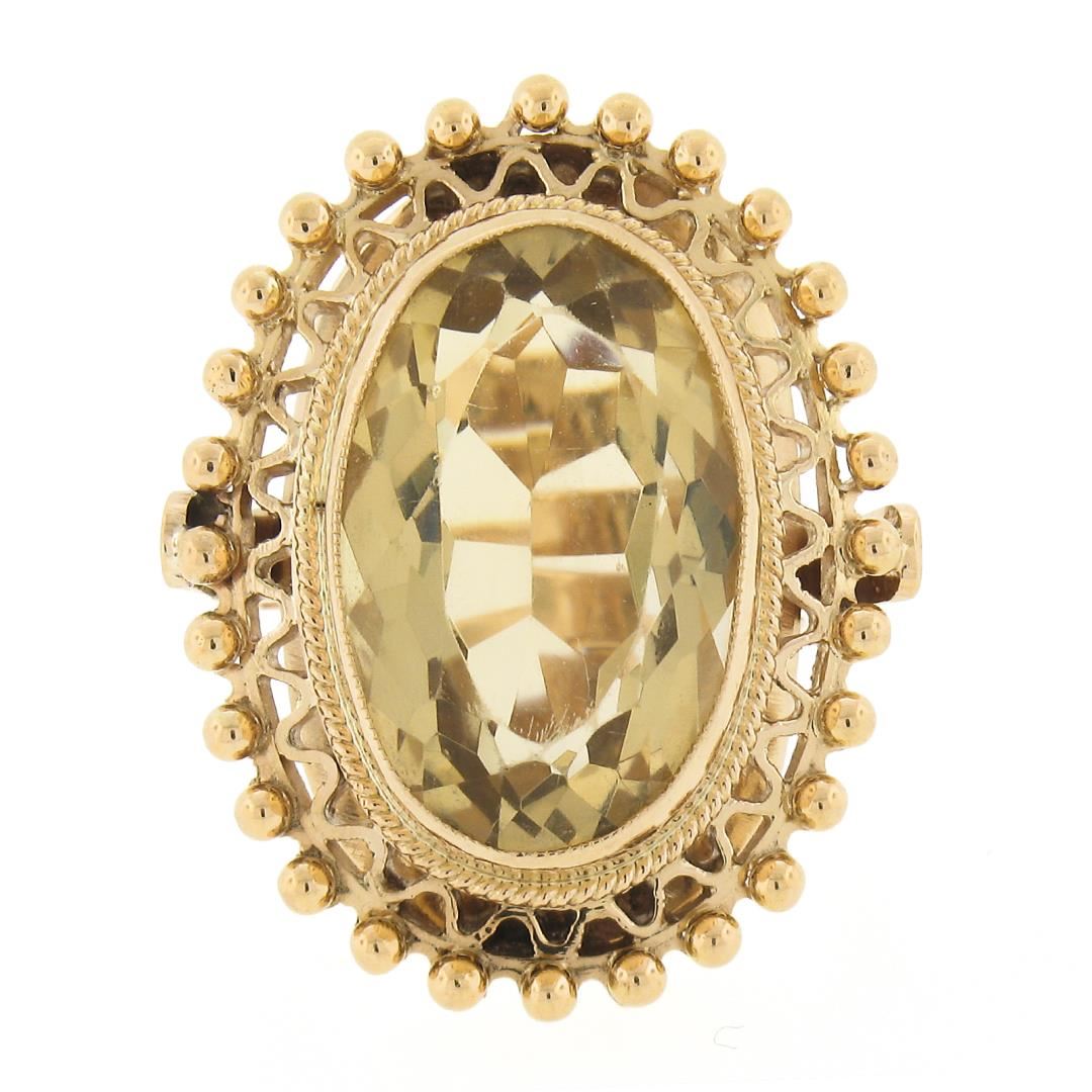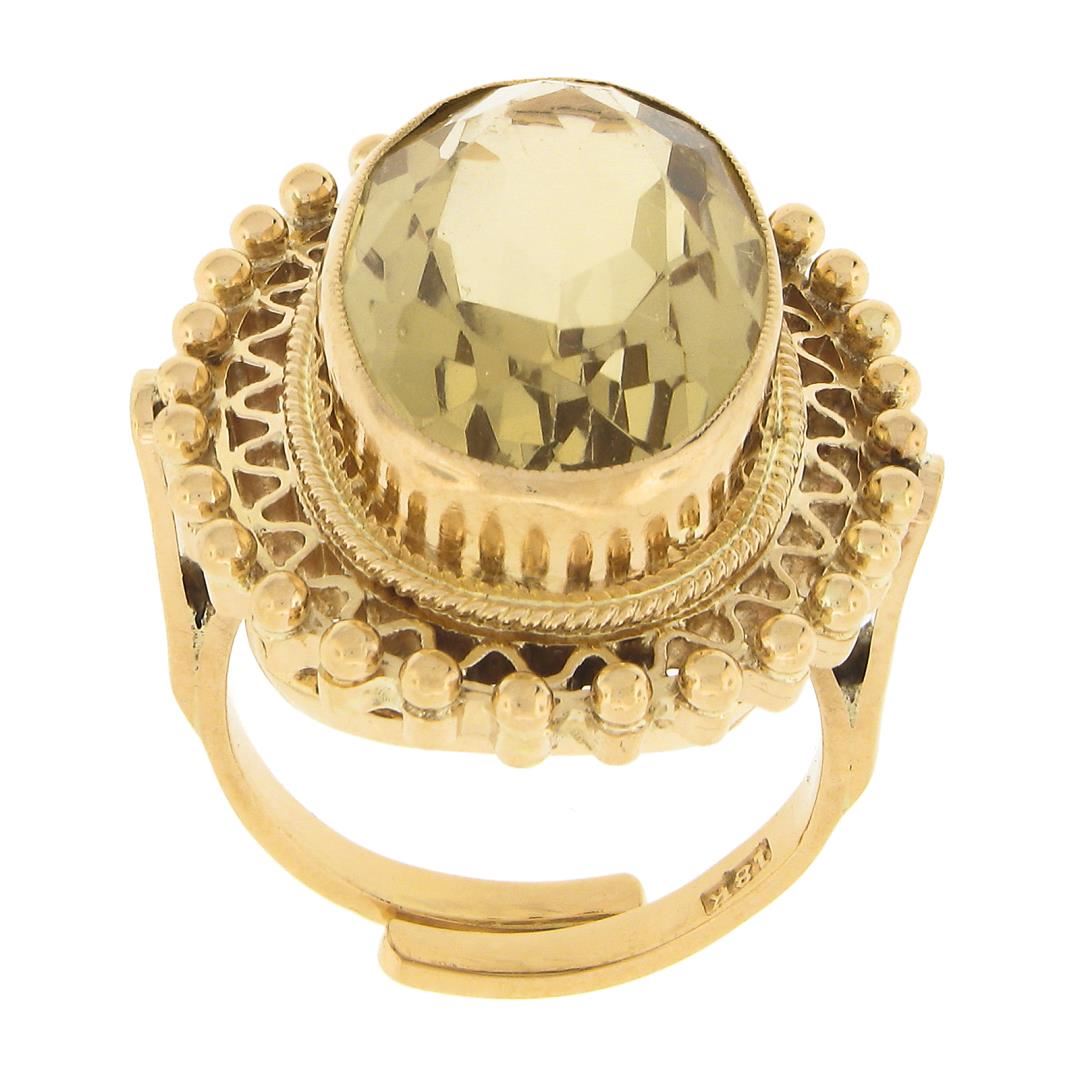 A vintage solid 18k yellow gold ring, with 1 oval cut natural citrine (18x12mm - 8.5 carat). The ring is size 4.0, weighs a total of 11.33 grams, and measures 27.5mm wide.