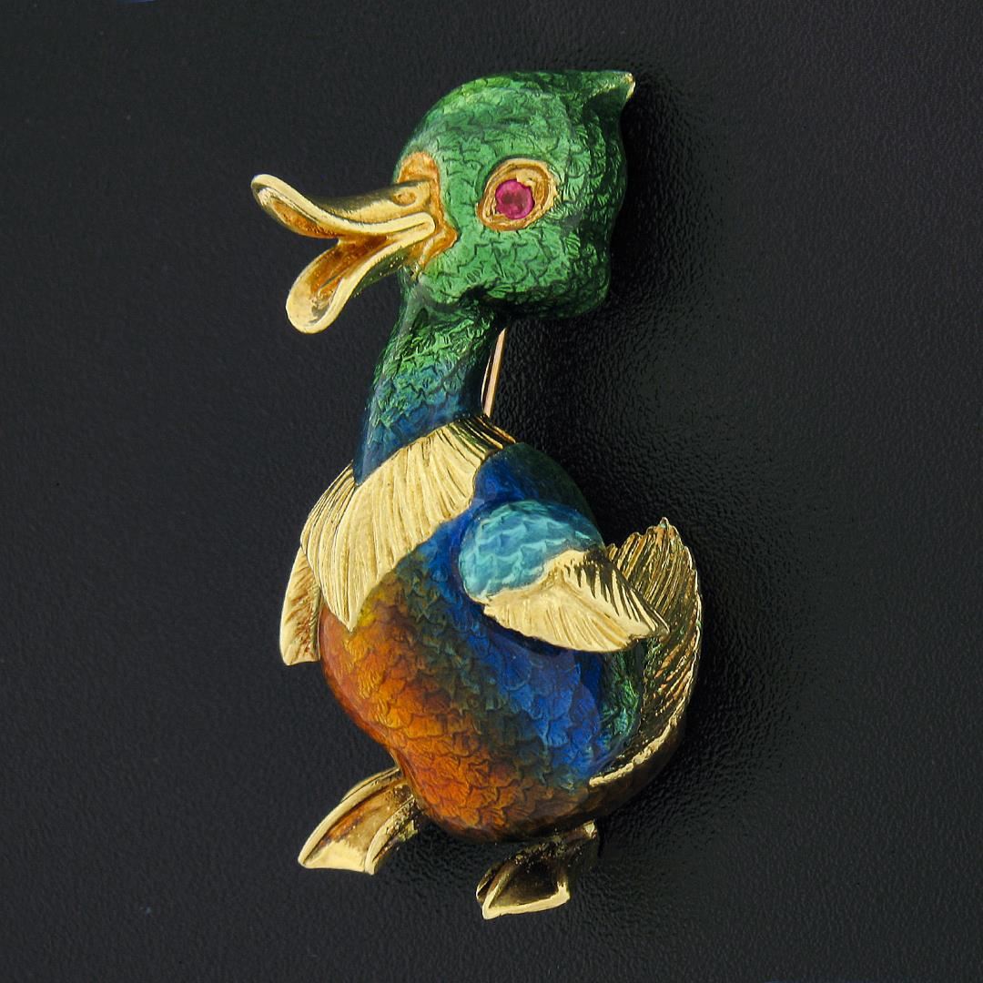 A vintage solid 18k yellow gold brooch, with multi colors enamel work $ 1 old single cut natural ruby (0.05ct). Measures 41.7x24.8mm and weighs a total of 12.86 grams.