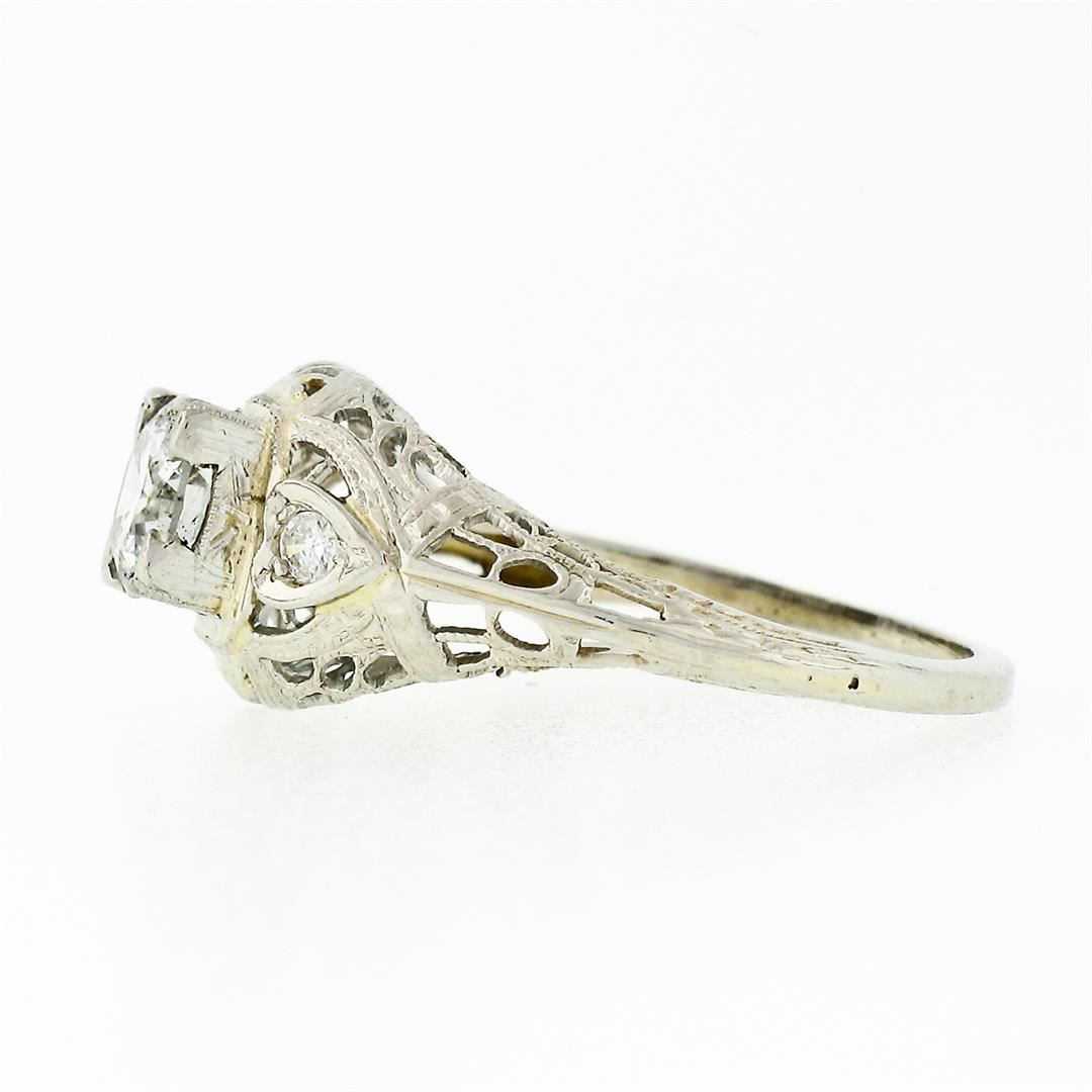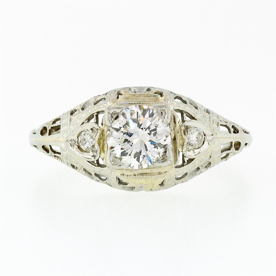 A vintage solide 18k white gold filigree engagement ring, with 1 old transitional cut natural diamond (H - SI2; 0.60ct), and 2 old single cut natural diamonds (G/H - SI1/SI2; 0.06ctw). The ring is size 5.5, weighs a total of 2.17 grams, and measures 9mm wide.