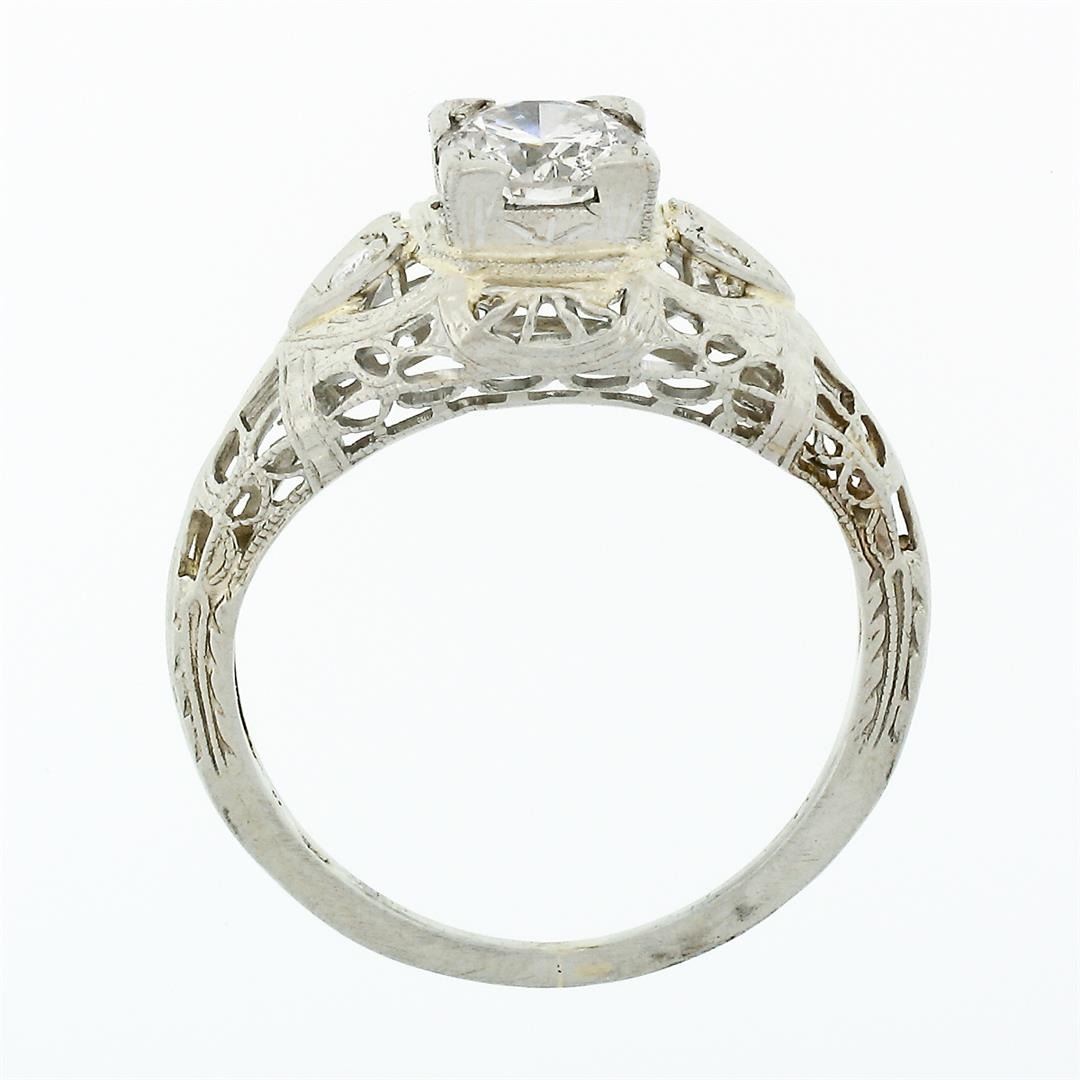 A vintage solide 18k white gold filigree engagement ring, with 1 old transitional cut natural diamond (H - SI2; 0.60ct), and 2 old single cut natural diamonds (G/H - SI1/SI2; 0.06ctw). The ring is size 5.5, weighs a total of 2.17 grams, and measures 9mm wide.
