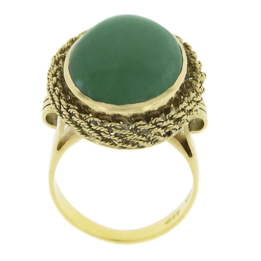 A vintage solid 18k yellow gold ring, with 1 oval cabochon cut natural jade (17.8x12.4mm). The ring is size 5.0, weighs a total of 8.49 grams, and measures 22.5mm wide.