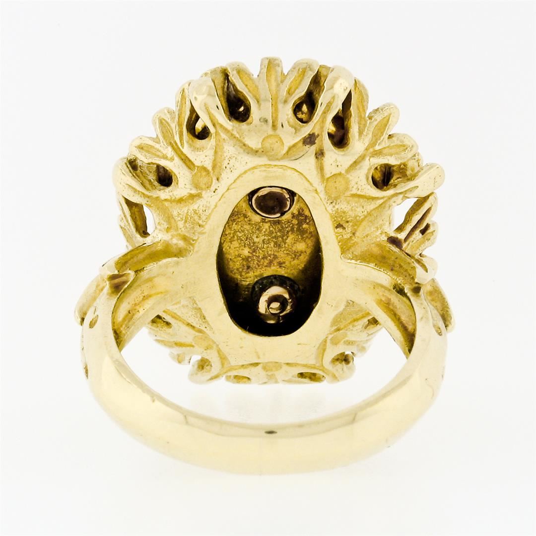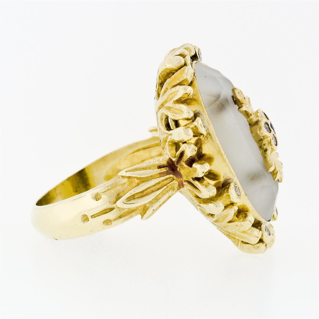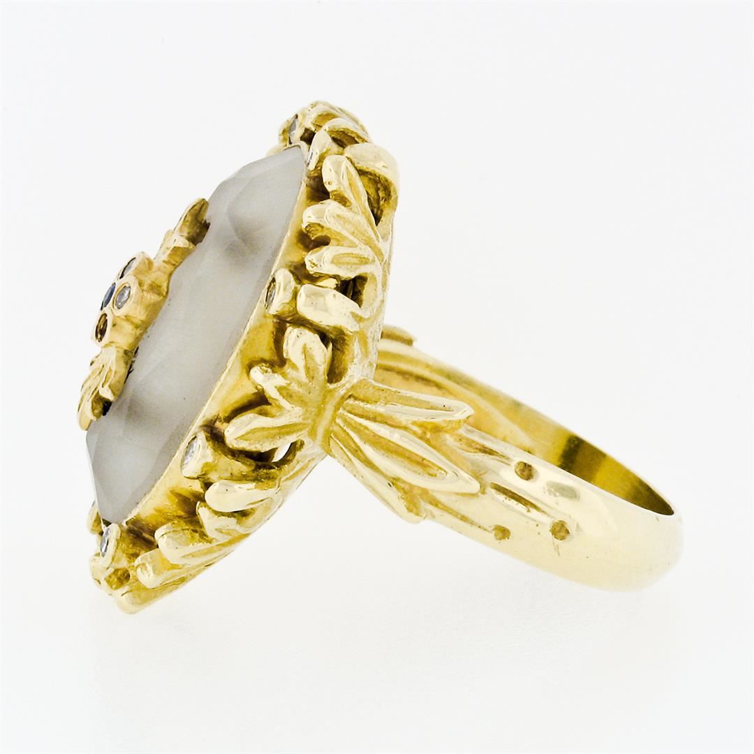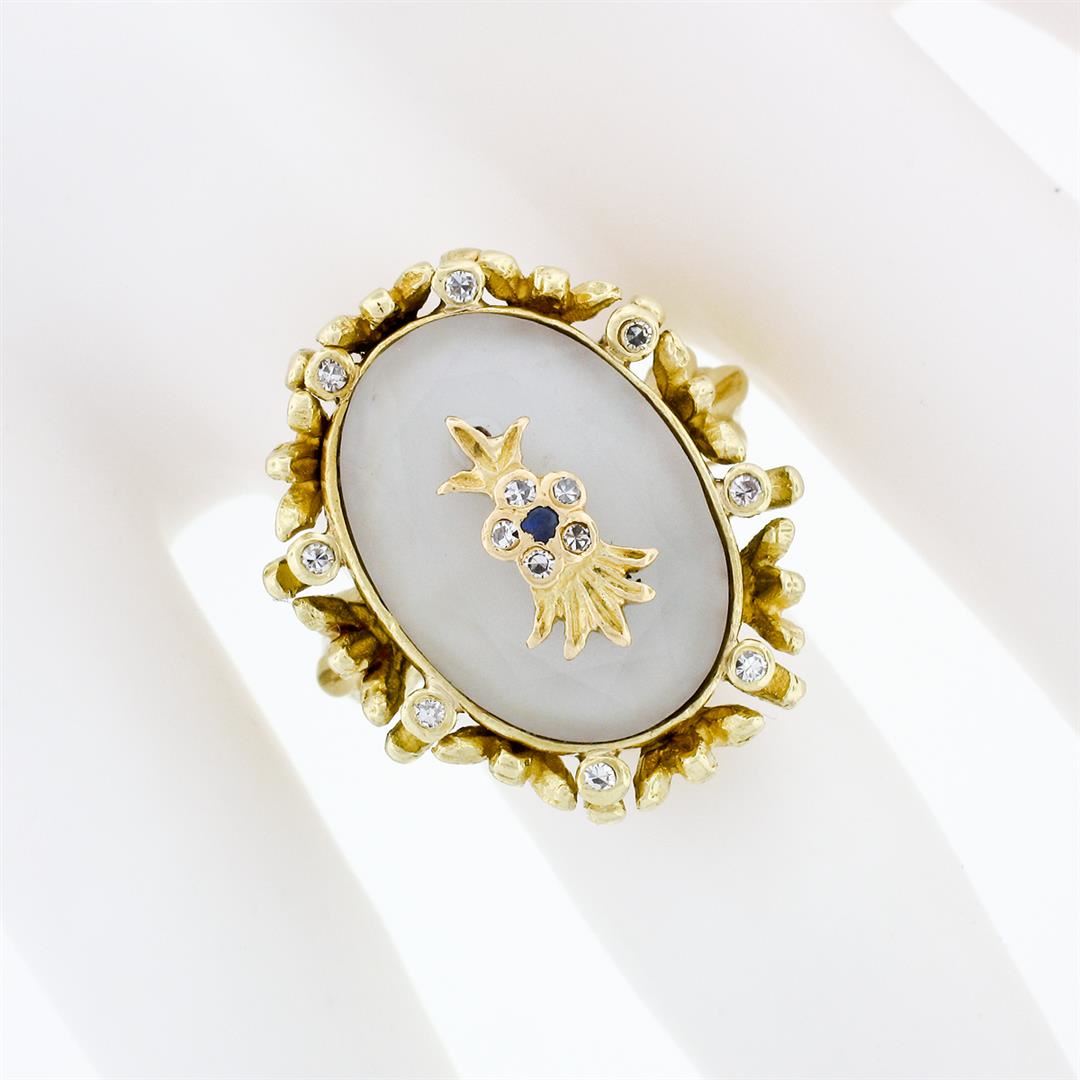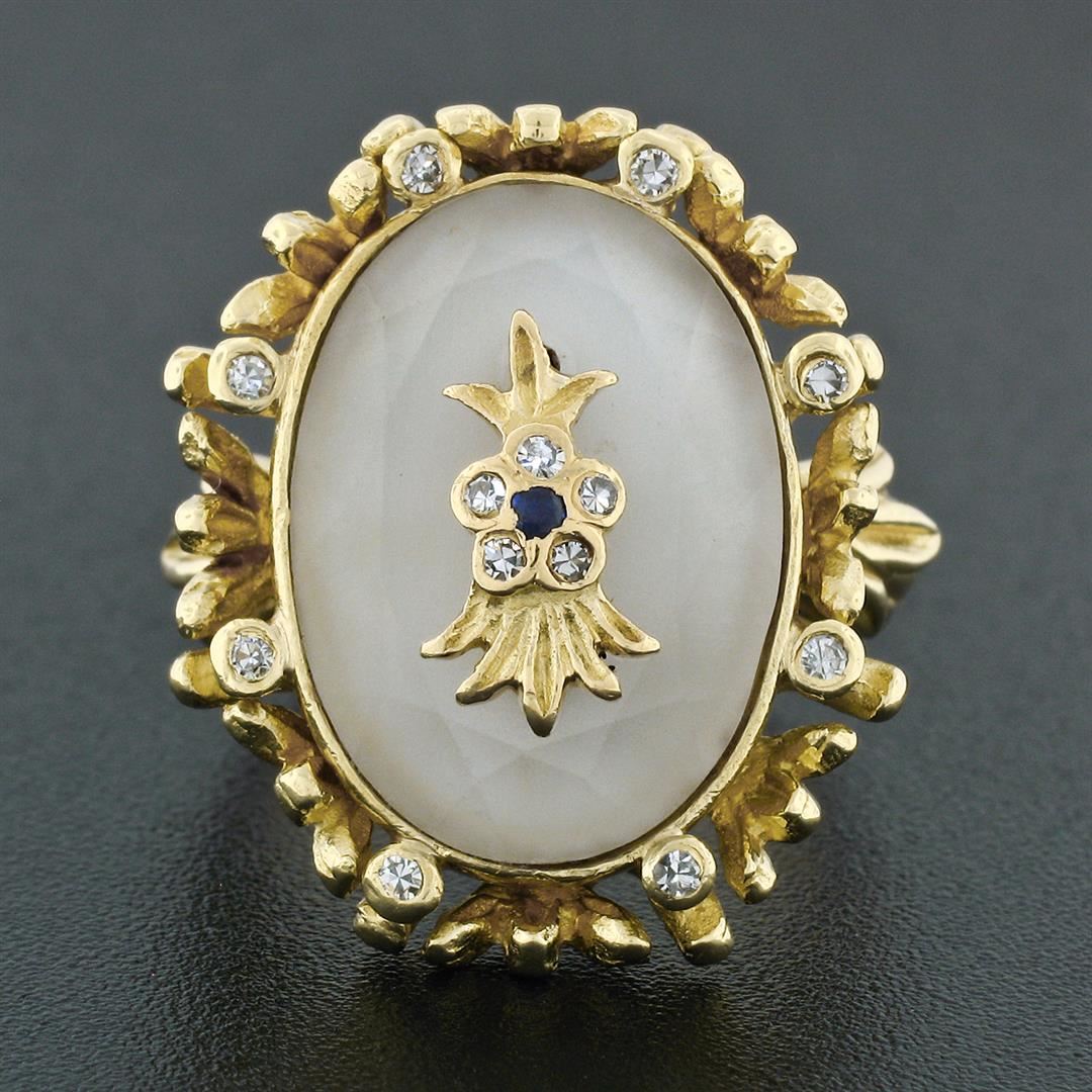A vintage solid 18k yellow gold cocktail ring, featuring faceted top oval cut genuine rock crystal (17.90x12.90mm), and 1 round cut natural sapphire (0.02ct), with 13 round single cut natural diamonds (G/H - VS2 ; 0.15ctw). The ring is size 6, weighs a total of 14.86 grams, and measures 23.15mm wide.
