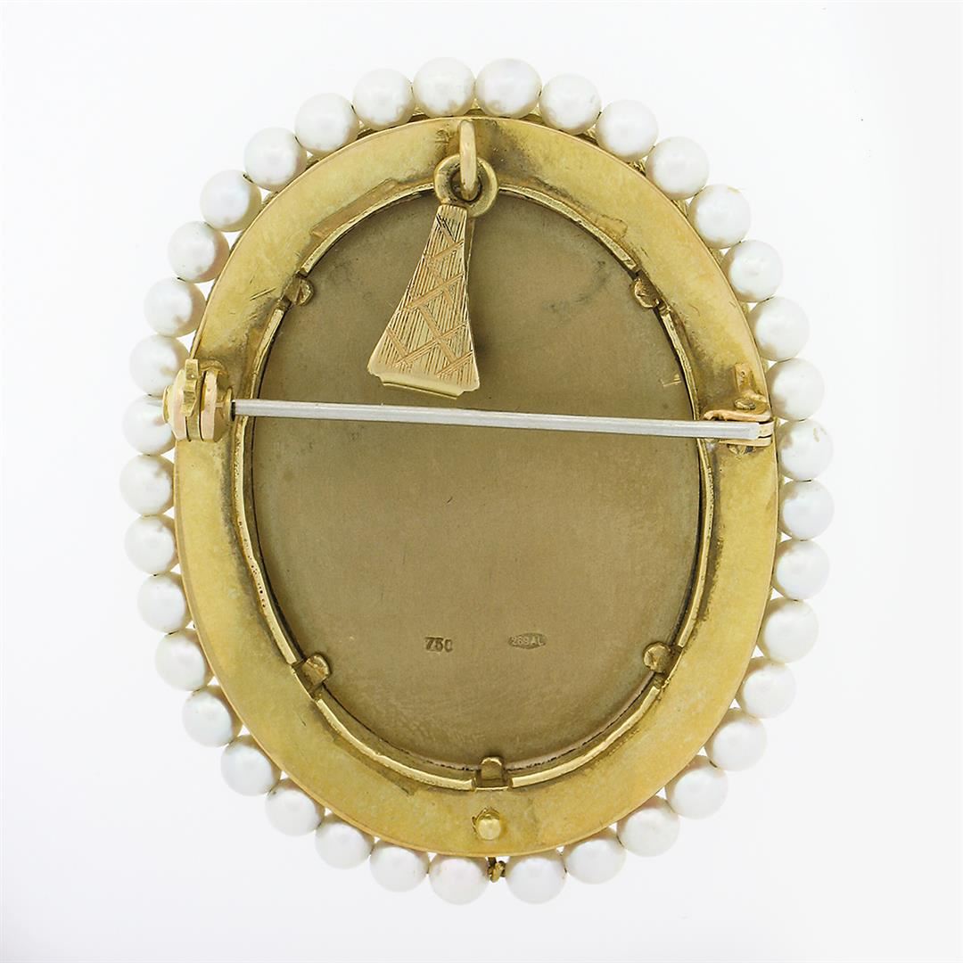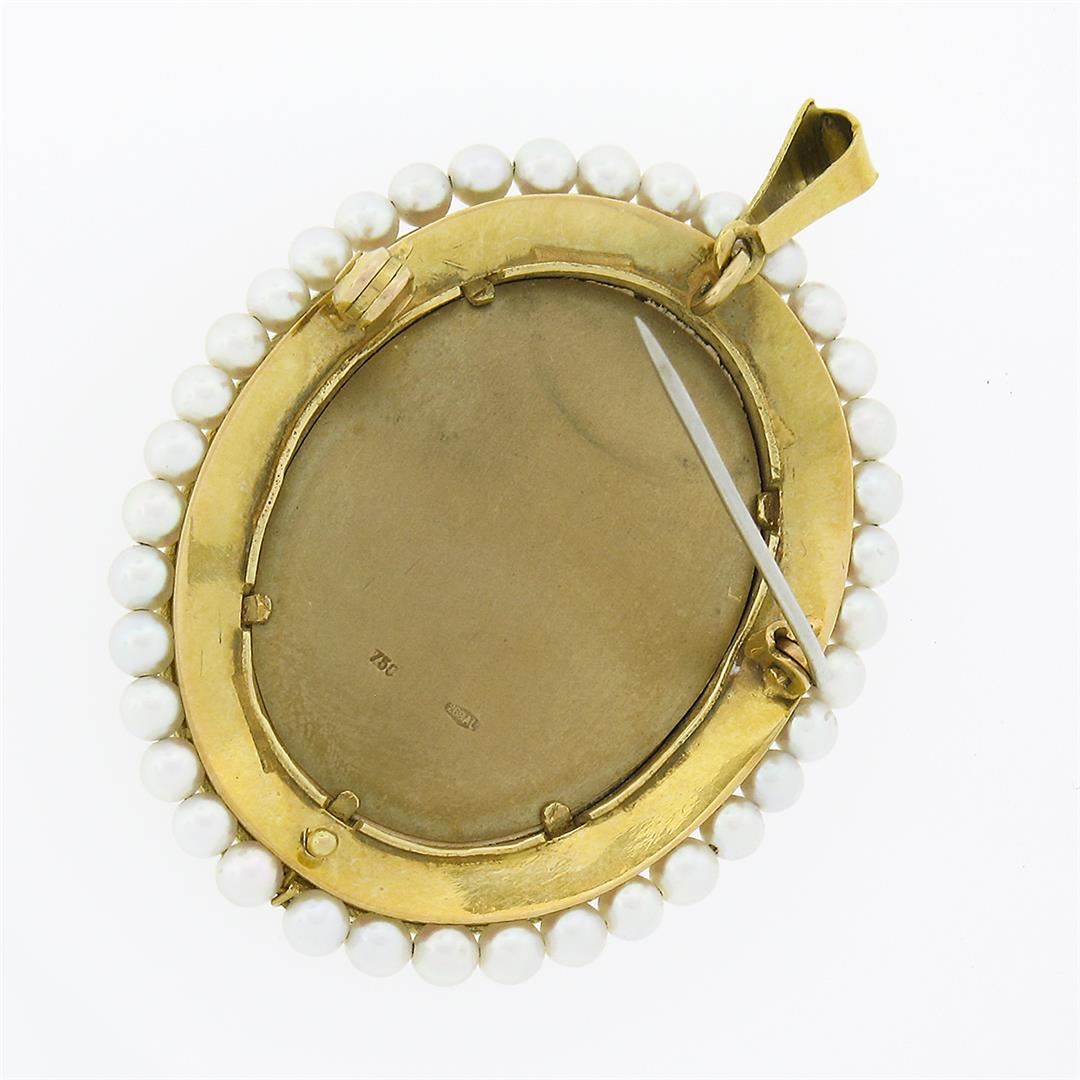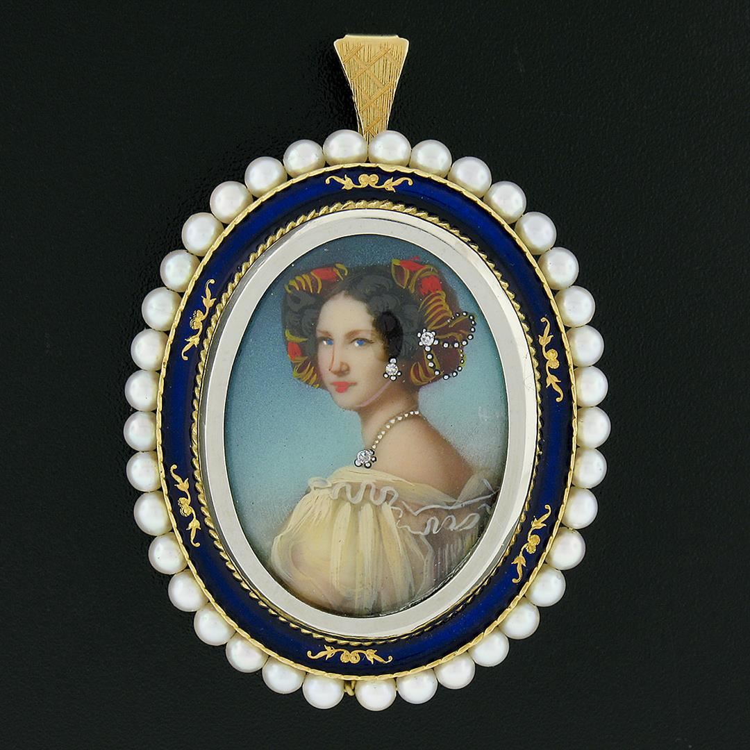 A vintage solid 18k yellow gold pin brooch pendant, with enamel work & 37 round shape cultured pearls (3.0mm each), and 3 old single cut natural diamonds (F/G - VS1/VS2 ; 0.05ctw). Measures 52.70x37.10mm and weighs a total of 17.20 grams.