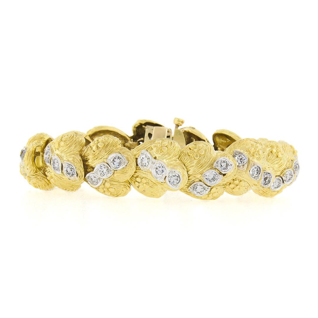 A vintage solid 18k yellow gold & platinum bracelet. with 45 old European & transitional cut natural diamonds (F/G - VS1-SI2 ; 5ctw). It weighs a total of 64.37 grams, measures 15.5mm wide, and measures 6.25 inches in length.