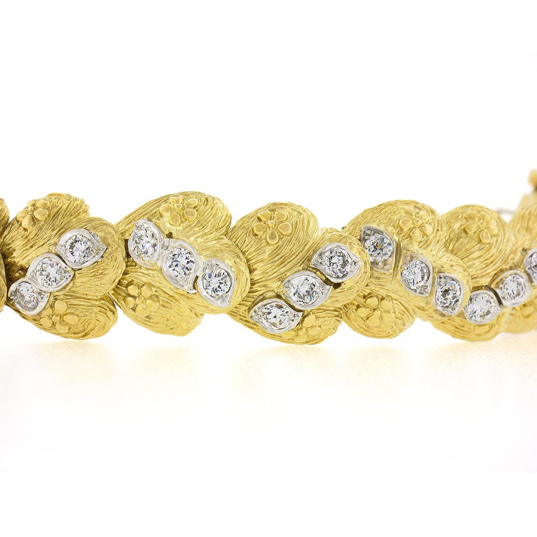 A vintage solid 18k yellow gold & platinum bracelet. with 45 old European & transitional cut natural diamonds (F/G - VS1-SI2 ; 5ctw). It weighs a total of 64.37 grams, measures 15.5mm wide, and measures 6.25 inches in length.