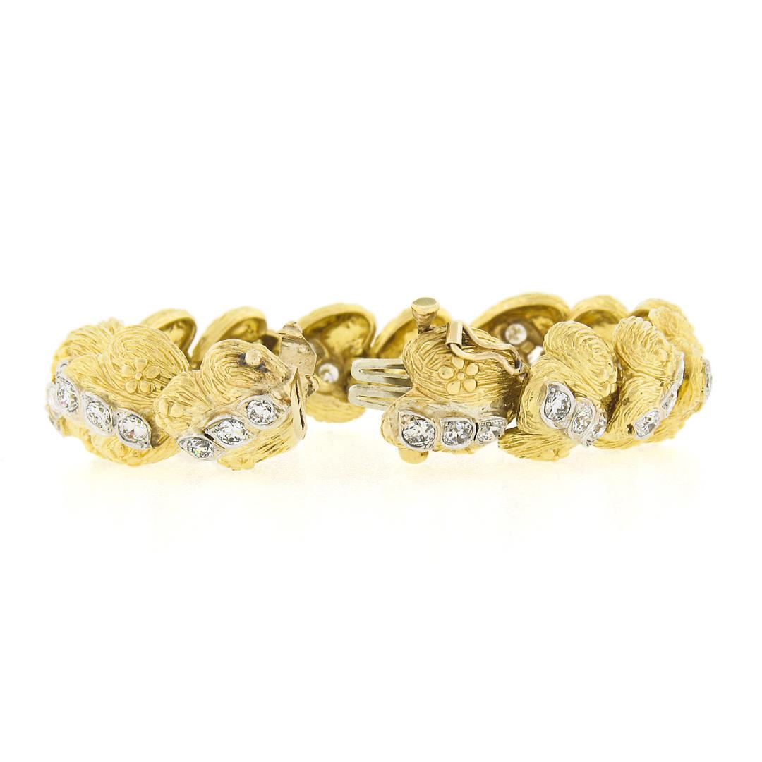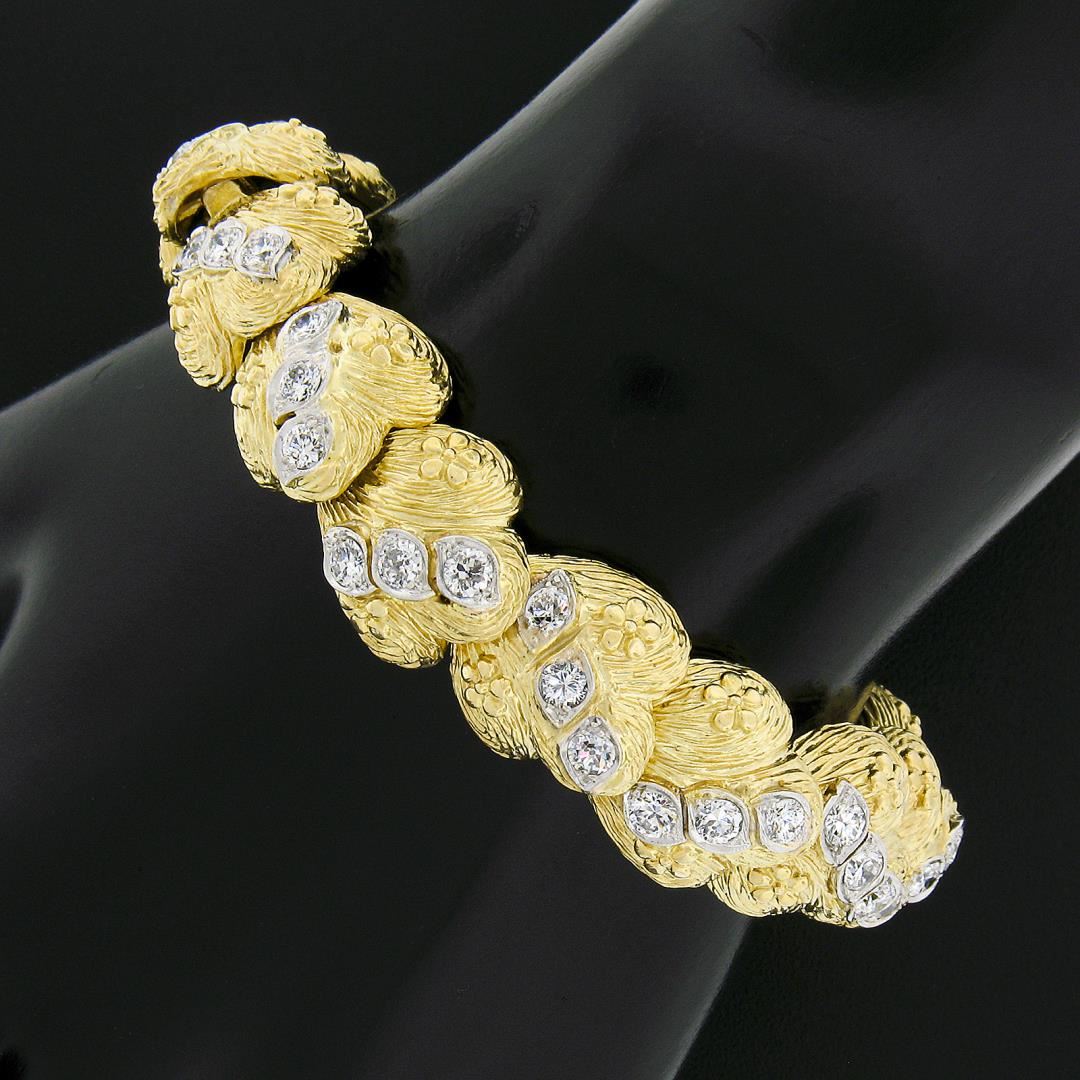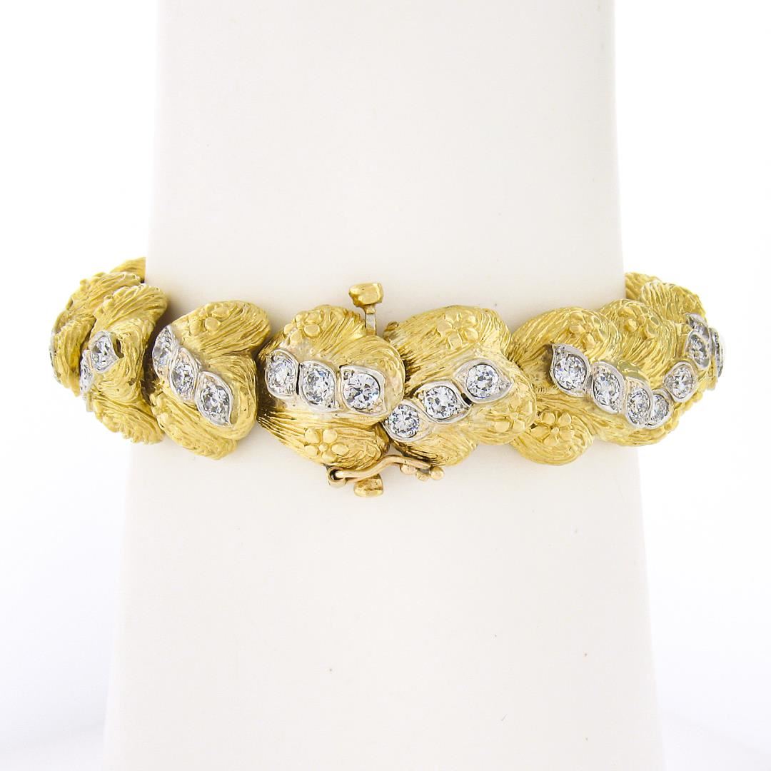 A vintage solid 18k yellow gold & platinum bracelet. with 45 old European & transitional cut natural diamonds (F/G - VS1-SI2 ; 5ctw). It weighs a total of 64.37 grams, measures 15.5mm wide, and measures 6.25 inches in length.