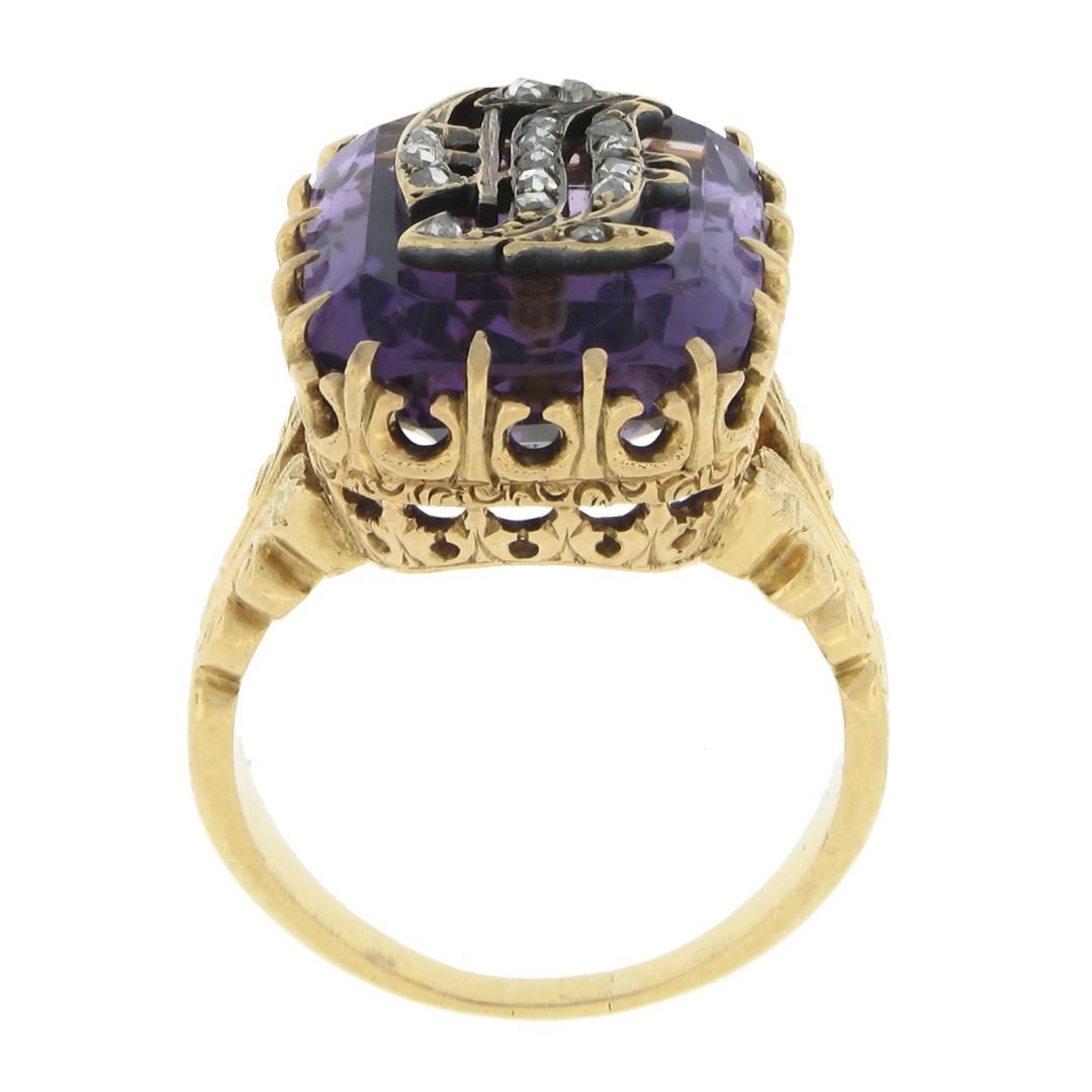 A vintage solid 18k yellow gold cocktail ring, with 1 elongated cushion cut natural amethyst (17.2x12.5mm), and 16 rose cut natural diamonds (H/I - SI1-I1 ; 0.30ctw). The ring is size 6.0, weighs a total of 9.53 grams, and measures 18.5mm wide.