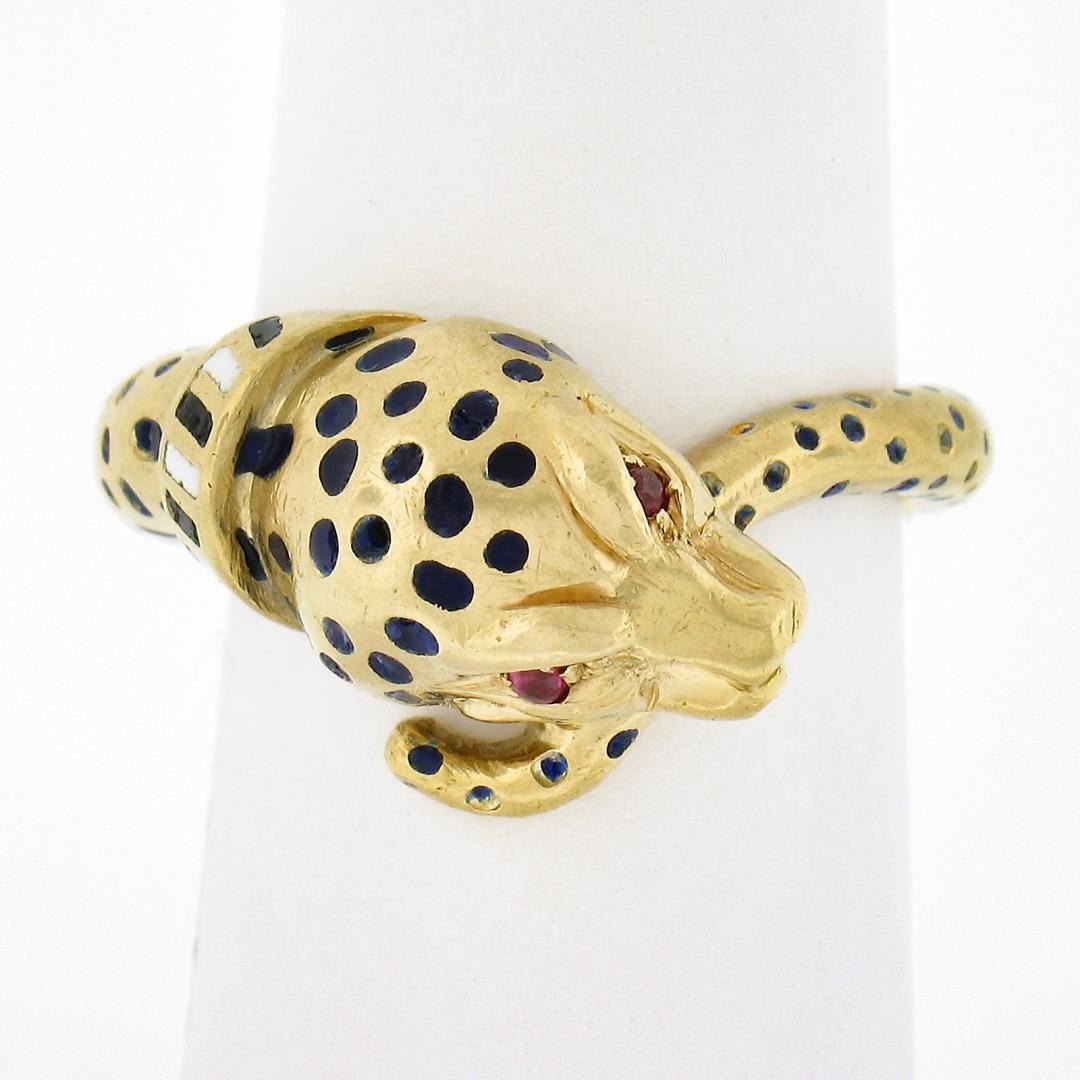 A vintage solid 18k yellow gold leopard ring with enamel work & 2 round brilliant cut natural rubies (0.03ctw). The ring is size 6.5, weighs a total of 12.37 grams, and measures 11.60mm wide.