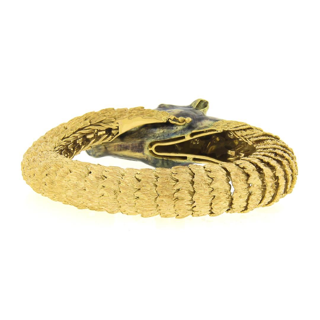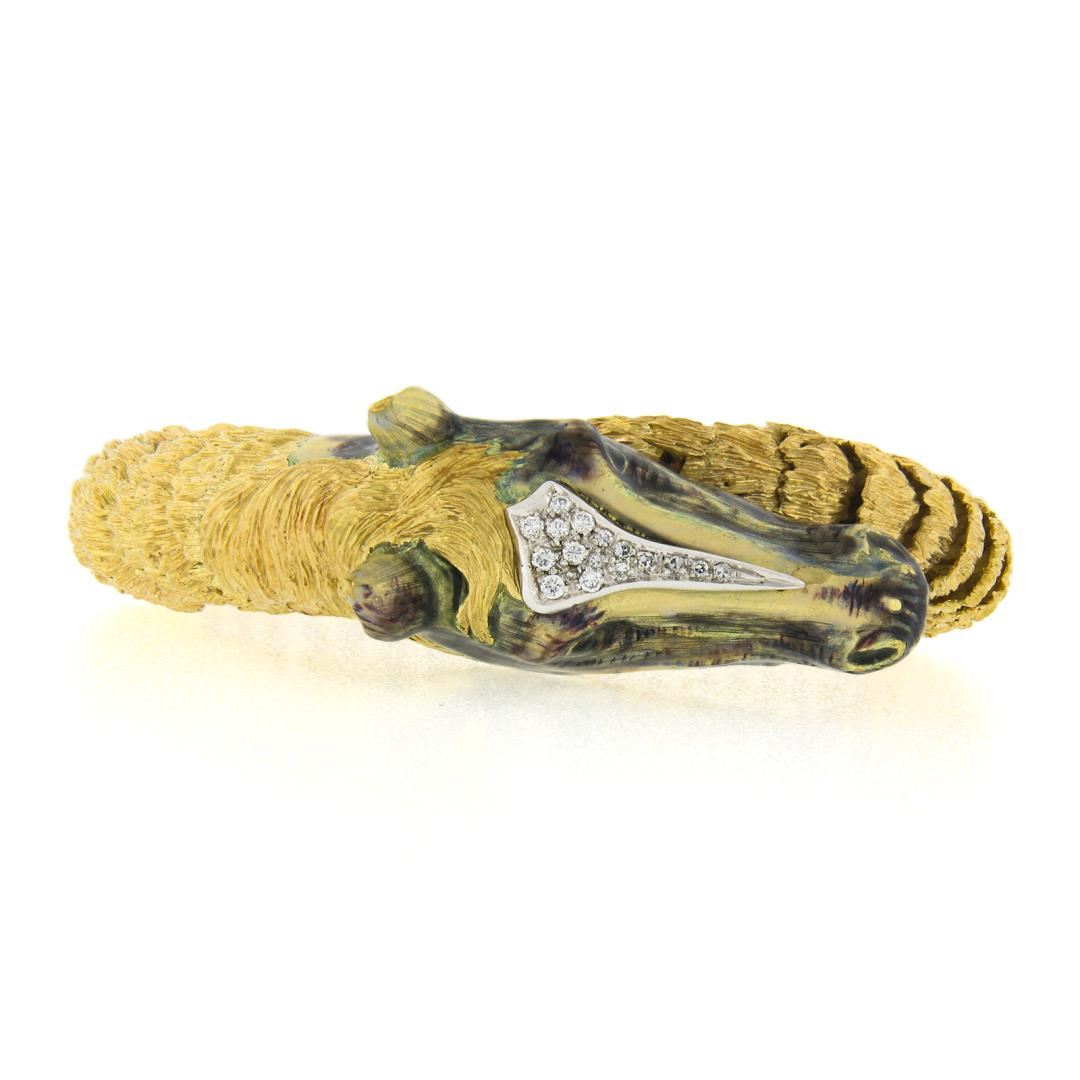 Vintage 18k Gold Textured Detailed Enamel 3D Horse Head Diamond Bangle Bracelet