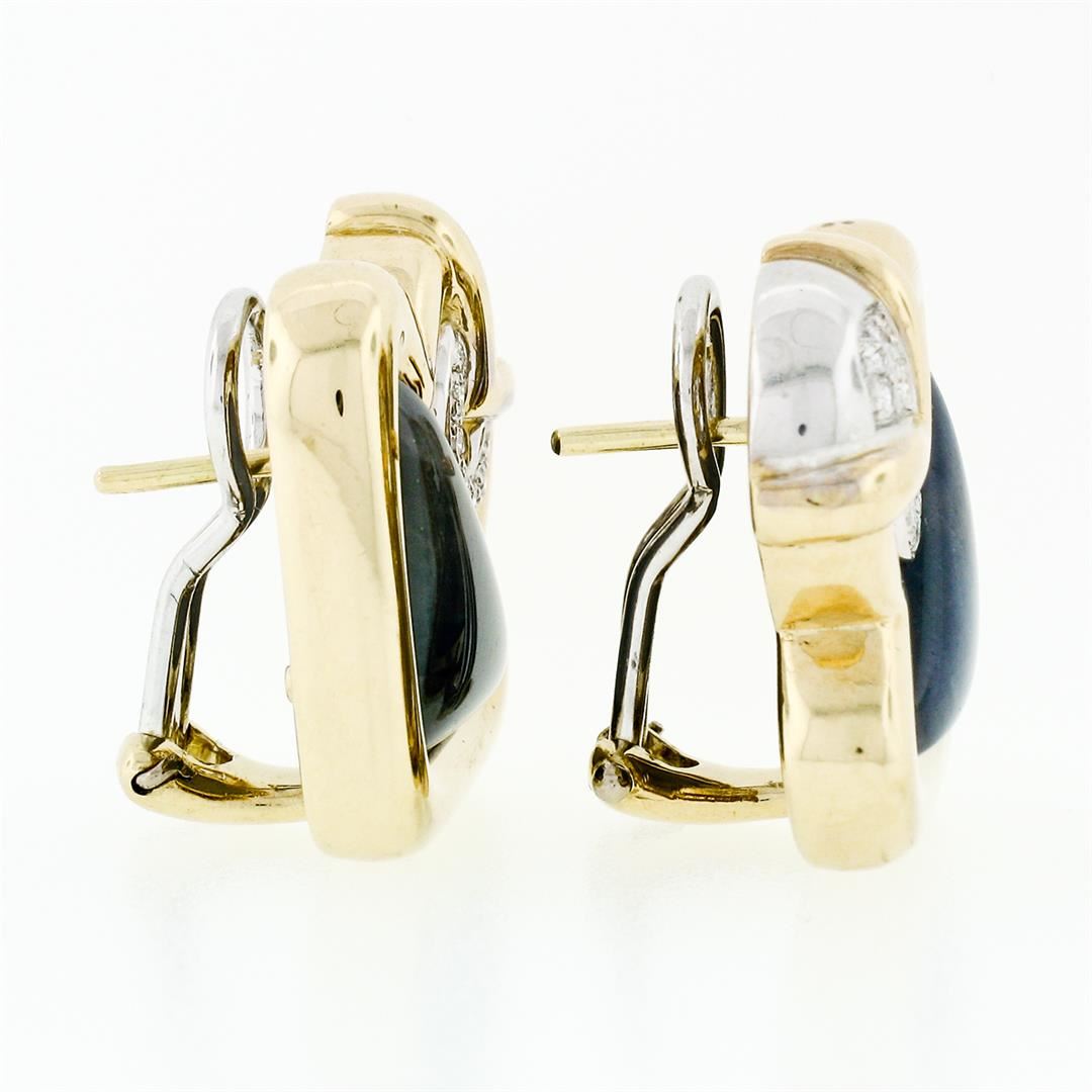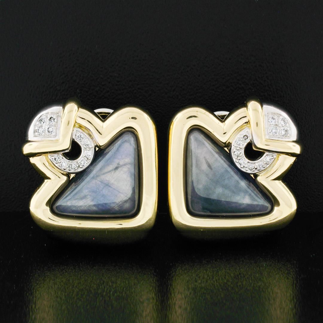 A pair of vintage solid 18k yellow gold earrings with 2 triangular natural sapphires (16.90x10.10mm) and 22 round brilliant cut natural diamonds (G/H - VS1/VS2; 0.30ctw). The earrings measure approximately 20.29x20.27mm and weigh a total of 19.22 grams.