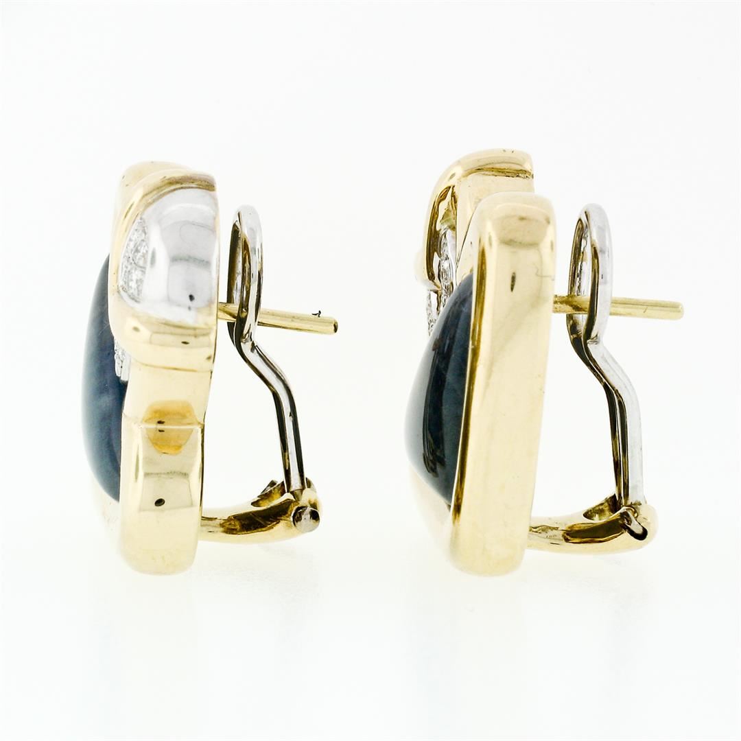 A pair of vintage solid 18k yellow gold earrings with 2 triangular natural sapphires (16.90x10.10mm) and 22 round brilliant cut natural diamonds (G/H - VS1/VS2; 0.30ctw). The earrings measure approximately 20.29x20.27mm and weigh a total of 19.22 grams.