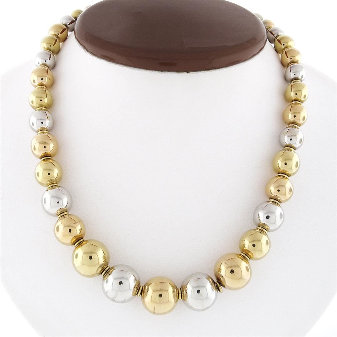 A vintage solid 18k yellow, rose & white gold necklace. 15.5 inch bead strand link chain, 67.90 grams total weight.