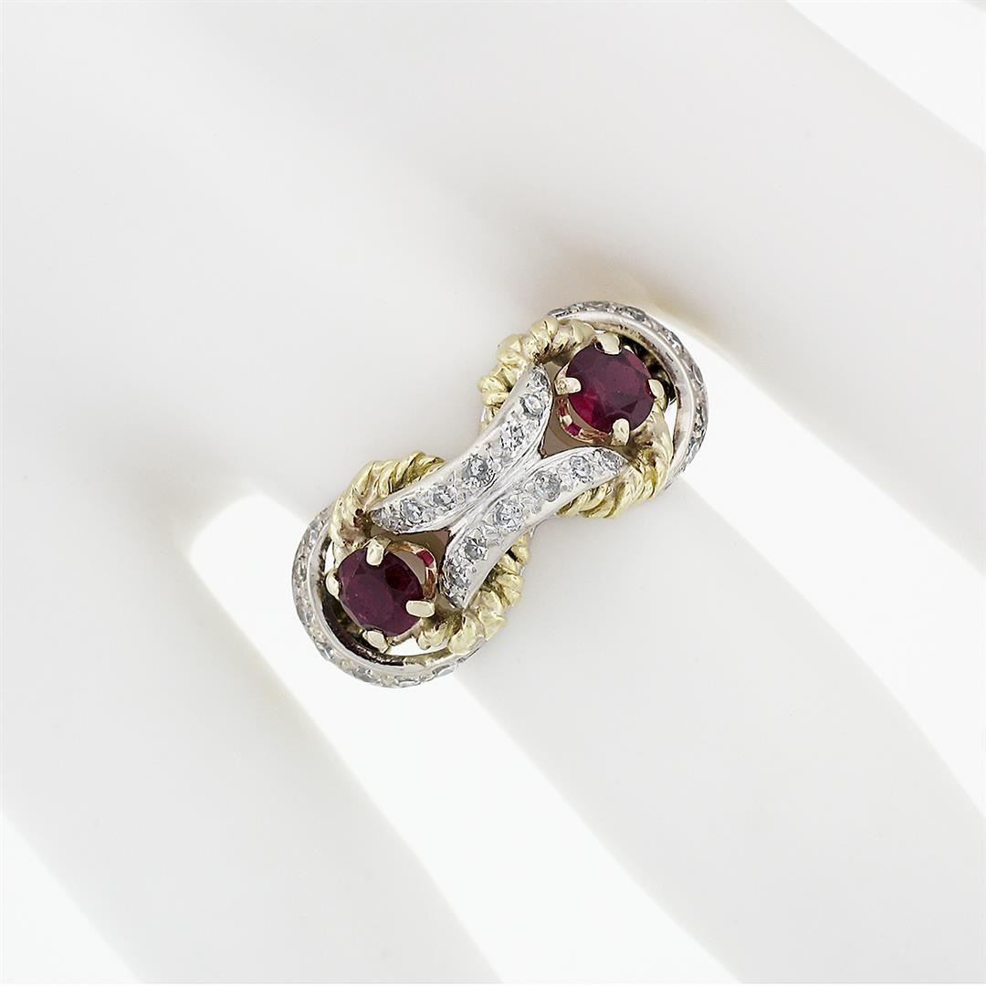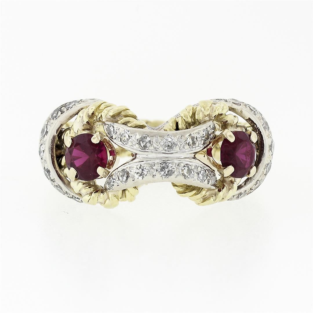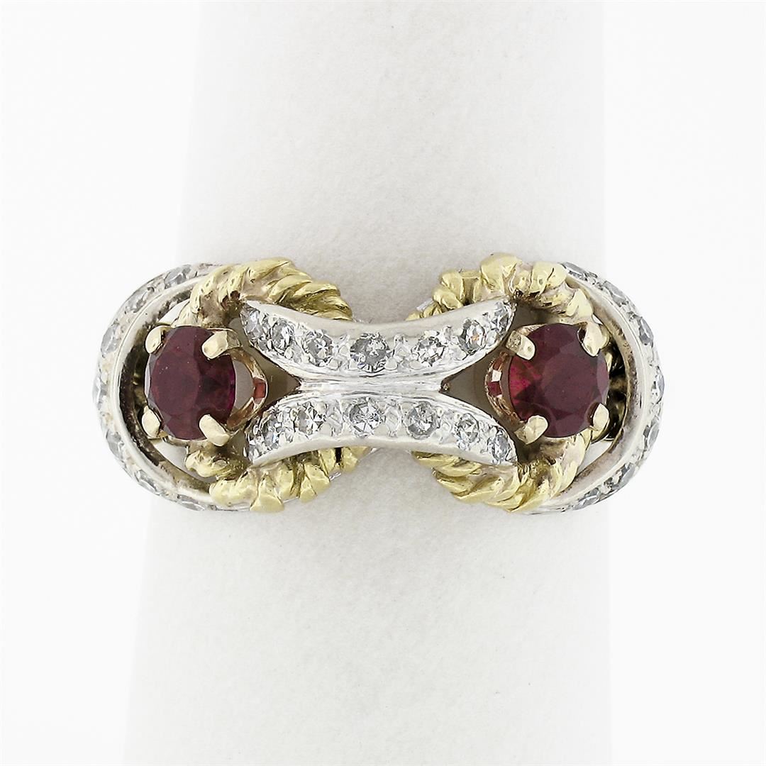 A vintage solid 18k yellow & white gold cocktail ring, with 27 old single cut natural diamonds (G/H- VS2; 0.27ctw), and 2 round brillaint cut red stones (4.1mm). The ring is size 6.5, weighs a total of 6.47 grams, and measures 9.5mm wide.