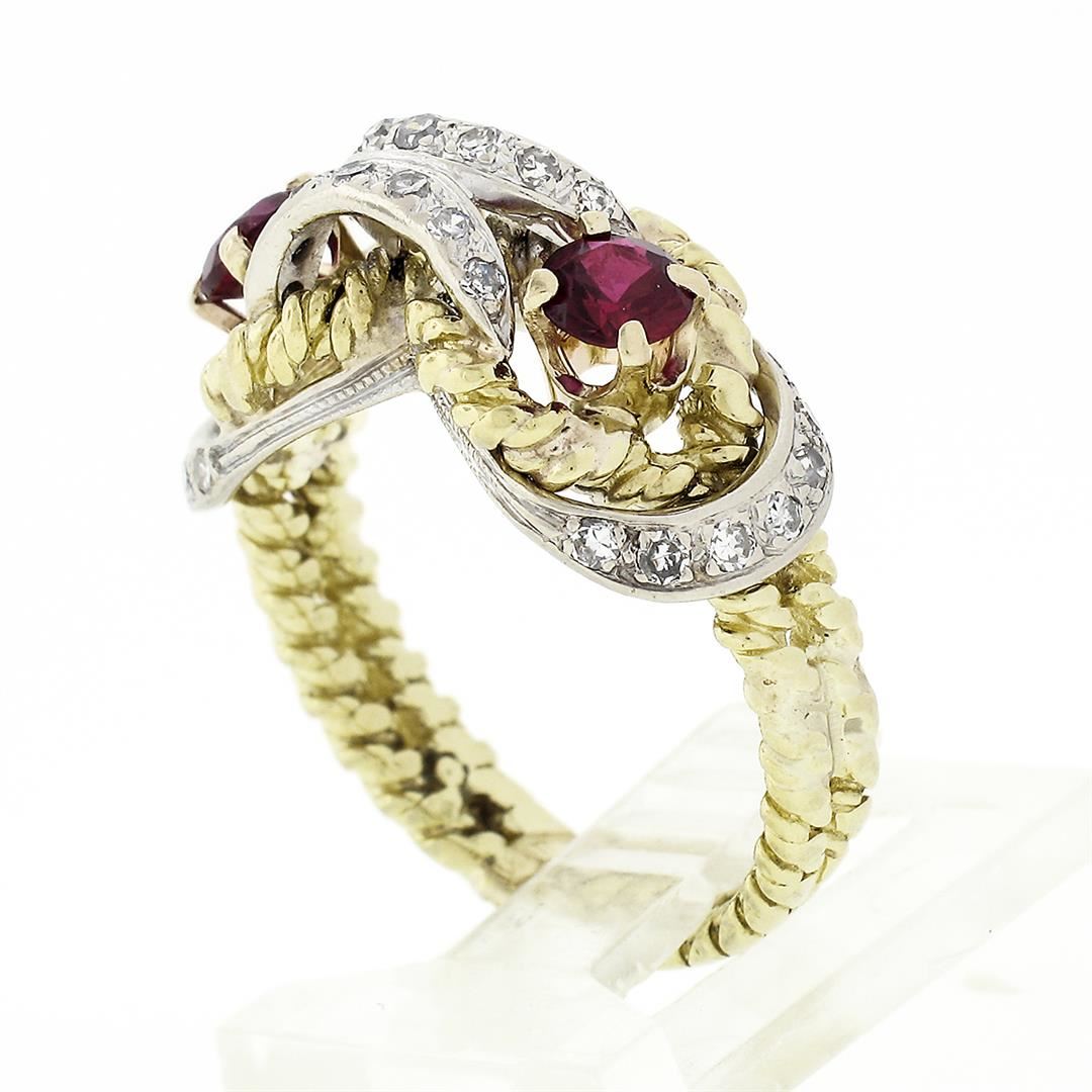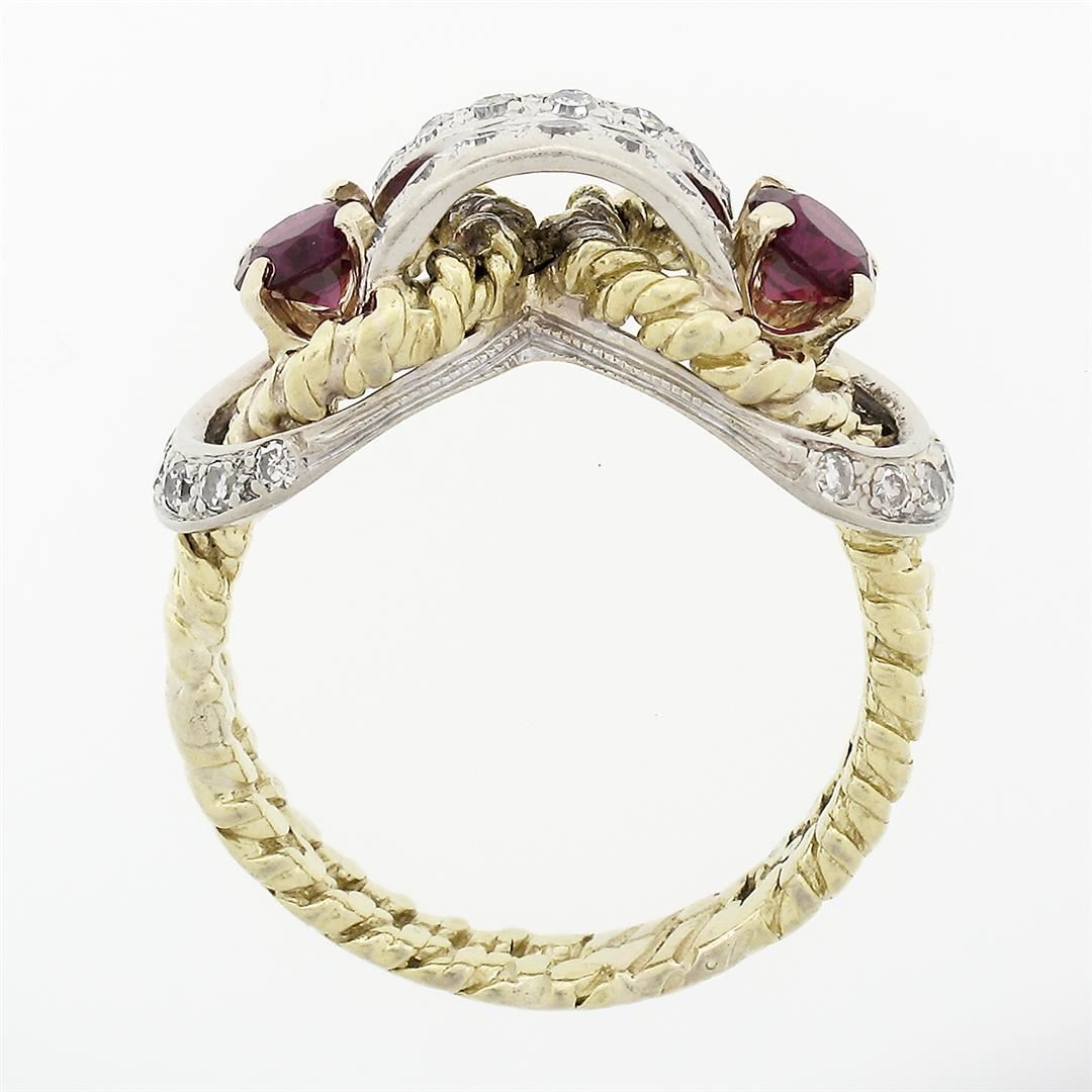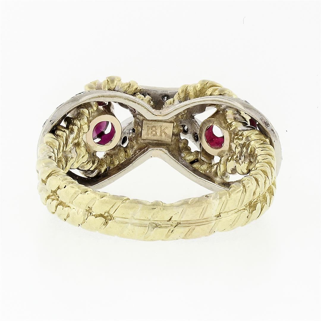 A vintage solid 18k yellow & white gold cocktail ring, with 27 old single cut natural diamonds (G/H- VS2; 0.27ctw), and 2 round brillaint cut red stones (4.1mm). The ring is size 6.5, weighs a total of 6.47 grams, and measures 9.5mm wide.