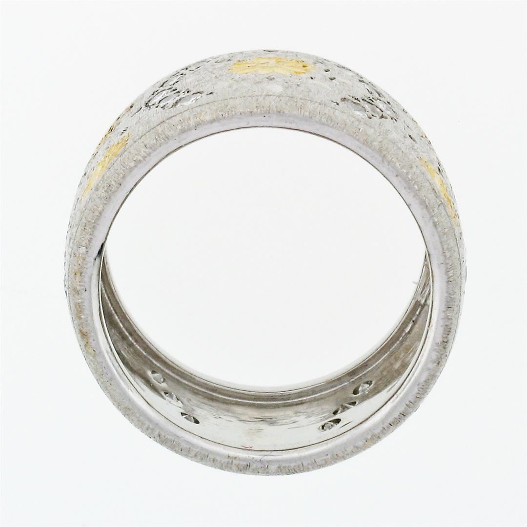 A vintage solid 18k yellow & white gold wide band ring, with 30 round brilliant cut natural diamonds (F/G - VS1/VS2 ; 0.30ctw). The ring is size 4.5, weighs a total of 9.30 grams, and measures 12mm wide.