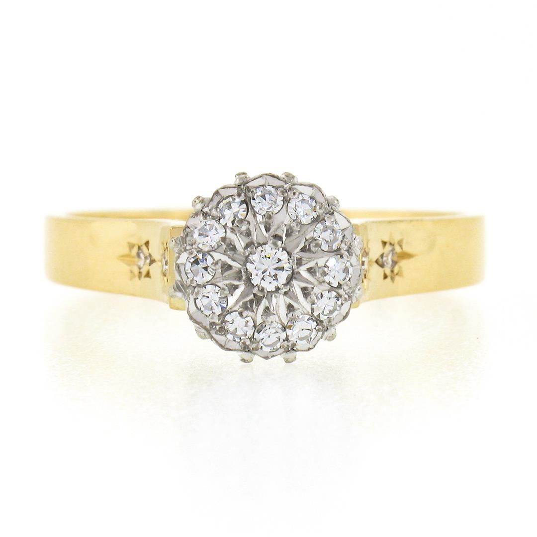A vinatge solid 18k two tone gold cluster ring, with 17 round brilliant & old single cut natrual diamonds (E/F - VS1/VS2 ; 0.30ctw). The ring is size 10.0, weighs a total of 5.0 grams, and measures 8.70mm wide.