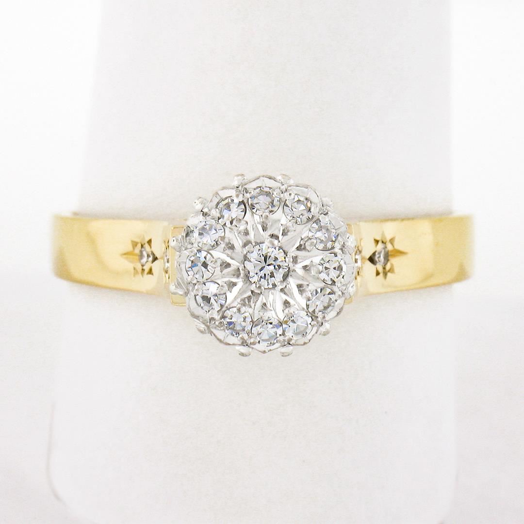 A vinatge solid 18k two tone gold cluster ring, with 17 round brilliant & old single cut natrual diamonds (E/F - VS1/VS2 ; 0.30ctw). The ring is size 10.0, weighs a total of 5.0 grams, and measures 8.70mm wide.
