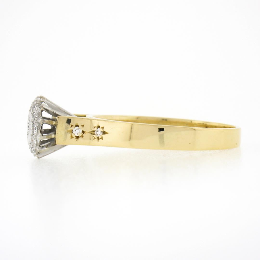 A vinatge solid 18k two tone gold cluster ring, with 17 round brilliant & old single cut natrual diamonds (E/F - VS1/VS2 ; 0.30ctw). The ring is size 10.0, weighs a total of 5.0 grams, and measures 8.70mm wide.