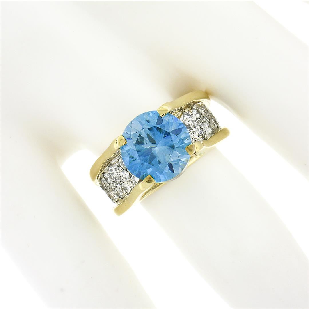 A vintage solid 18k yellow and white gold ring, with 1 Gia certified round brilliant cut blue zircon, and 45 round brilliant cut natural diamonds (G/H - VS1/VS2 ; 0.80ctw). The ring is size 6.25, weighs a total of 11.24 grams, and measures 9.80mm wide. Comes with all original relevant certifications.