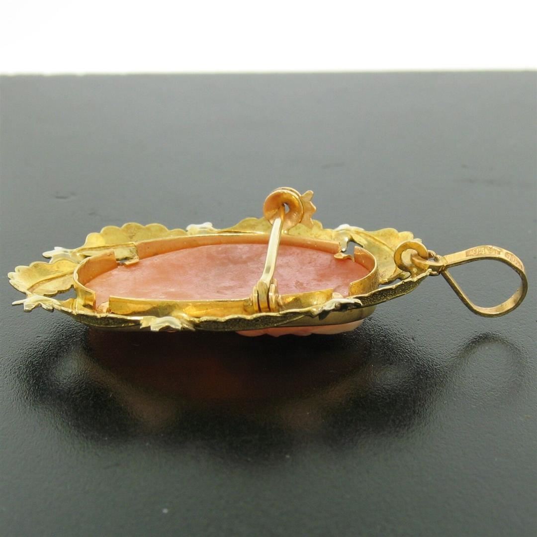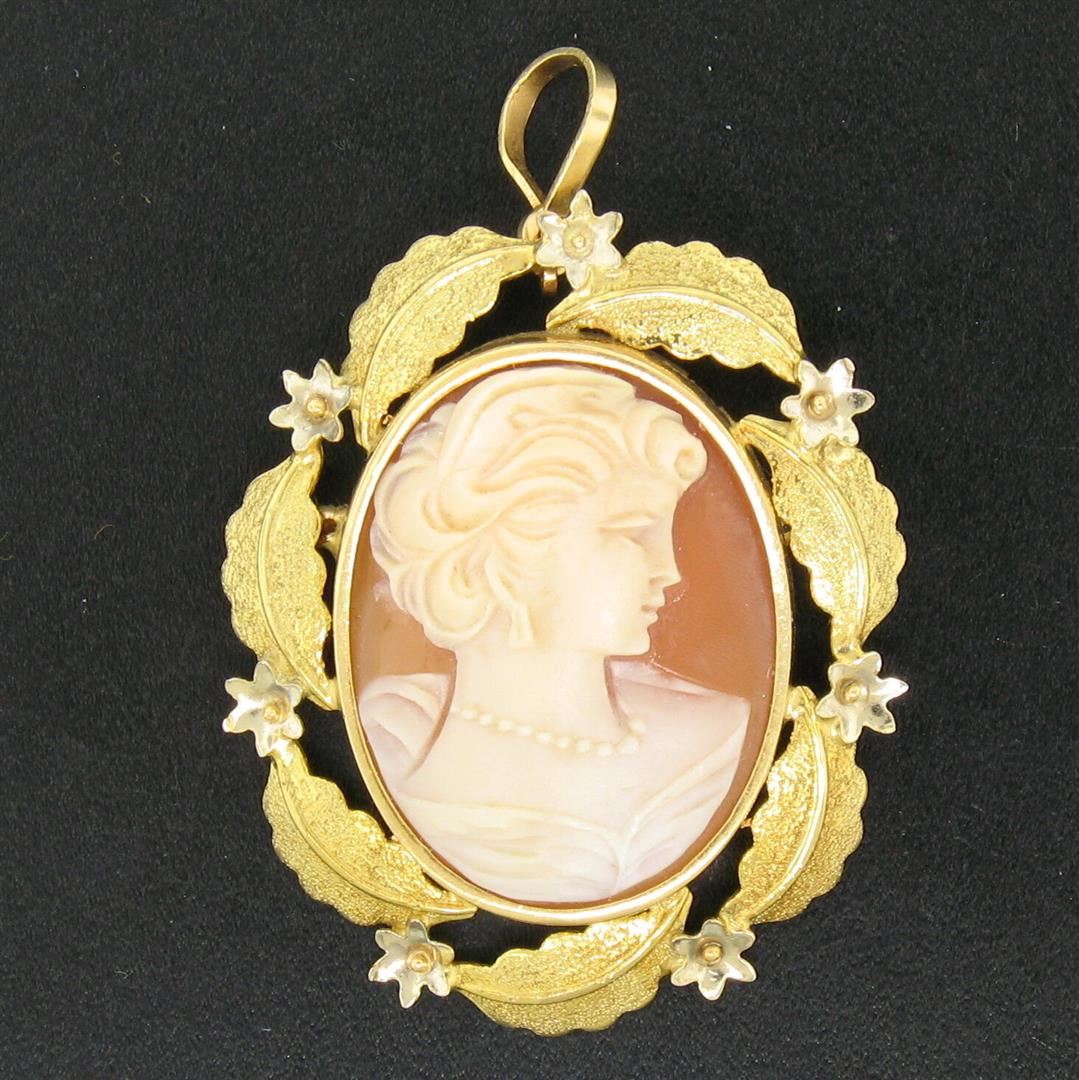 A vintage solid 18k yellow and white gold brooch or pendant, featuring 1 oval shape natural carved shell cameo (30.55x23.75mm). Measures 44.81x36.3mm and weighs a total of 11.0 grams.