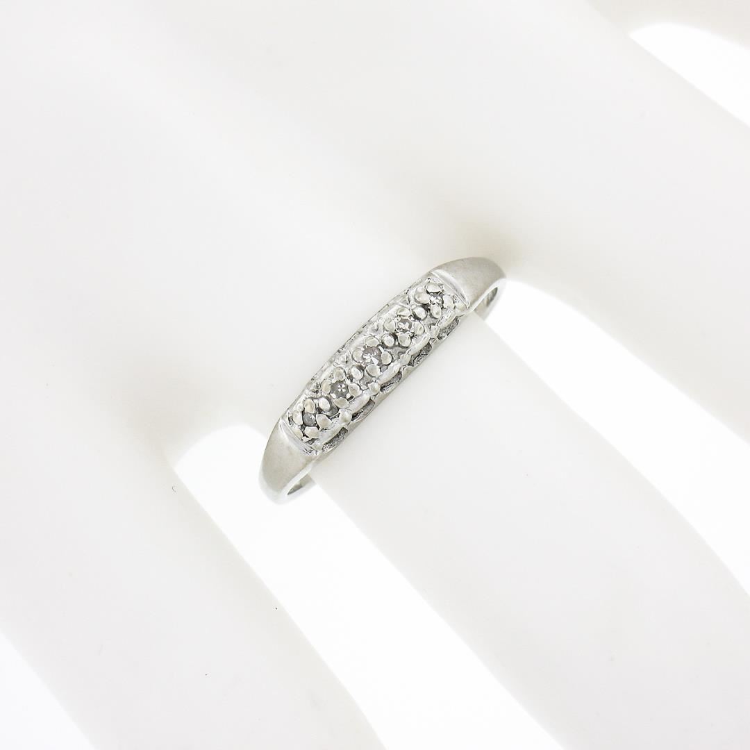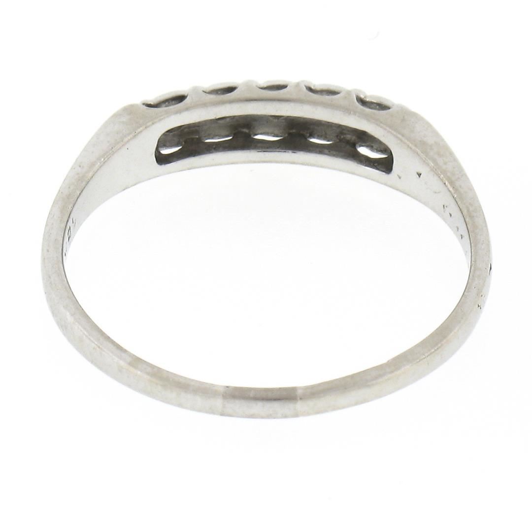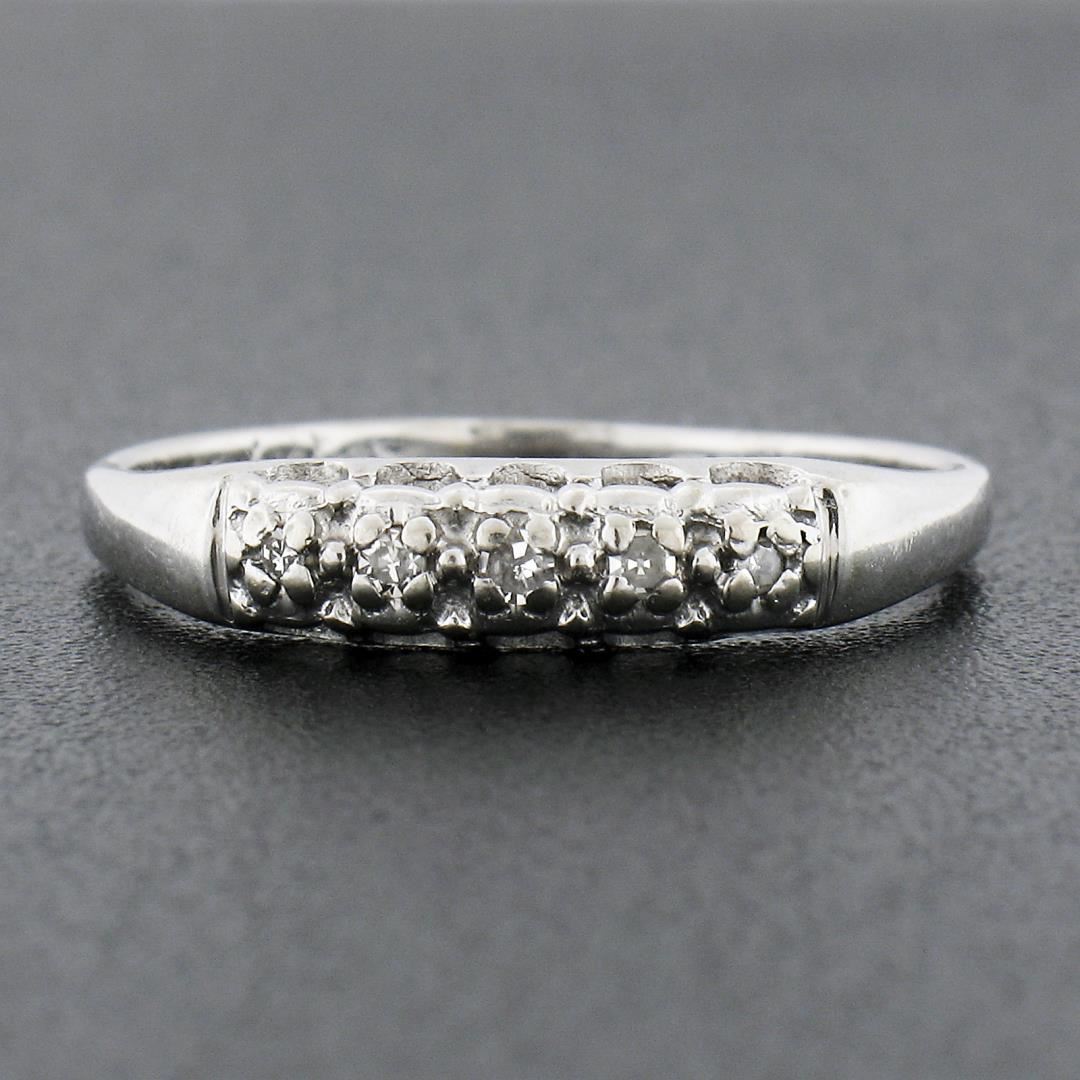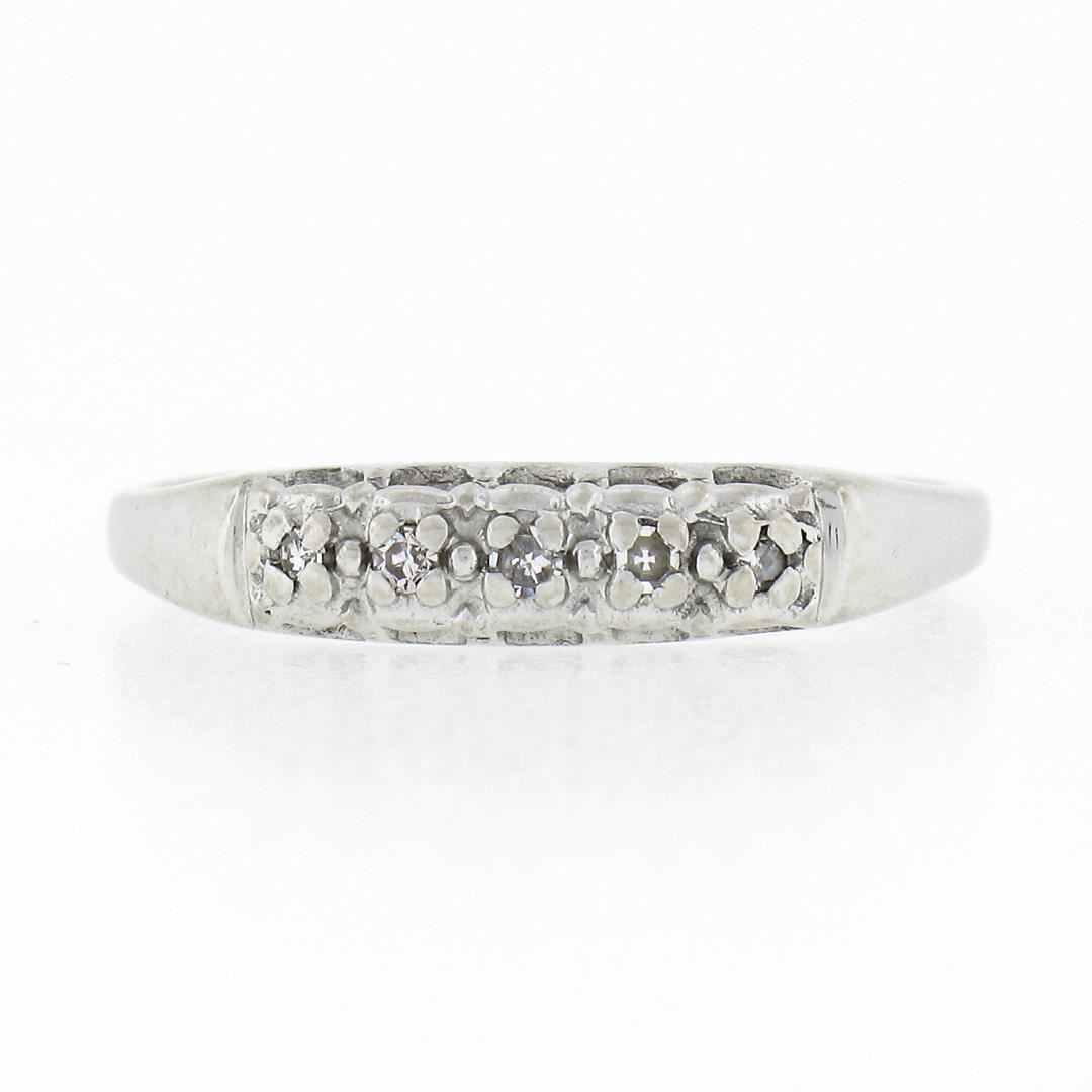 A vintage solid 18k white gold band ring. with 5 old single cut natural diamonds (H/I - SI2/I1 ; 0.05ctw). The ring is size 7.0, weighs a total of 2.09 grams, and measures 3.9mm wide.