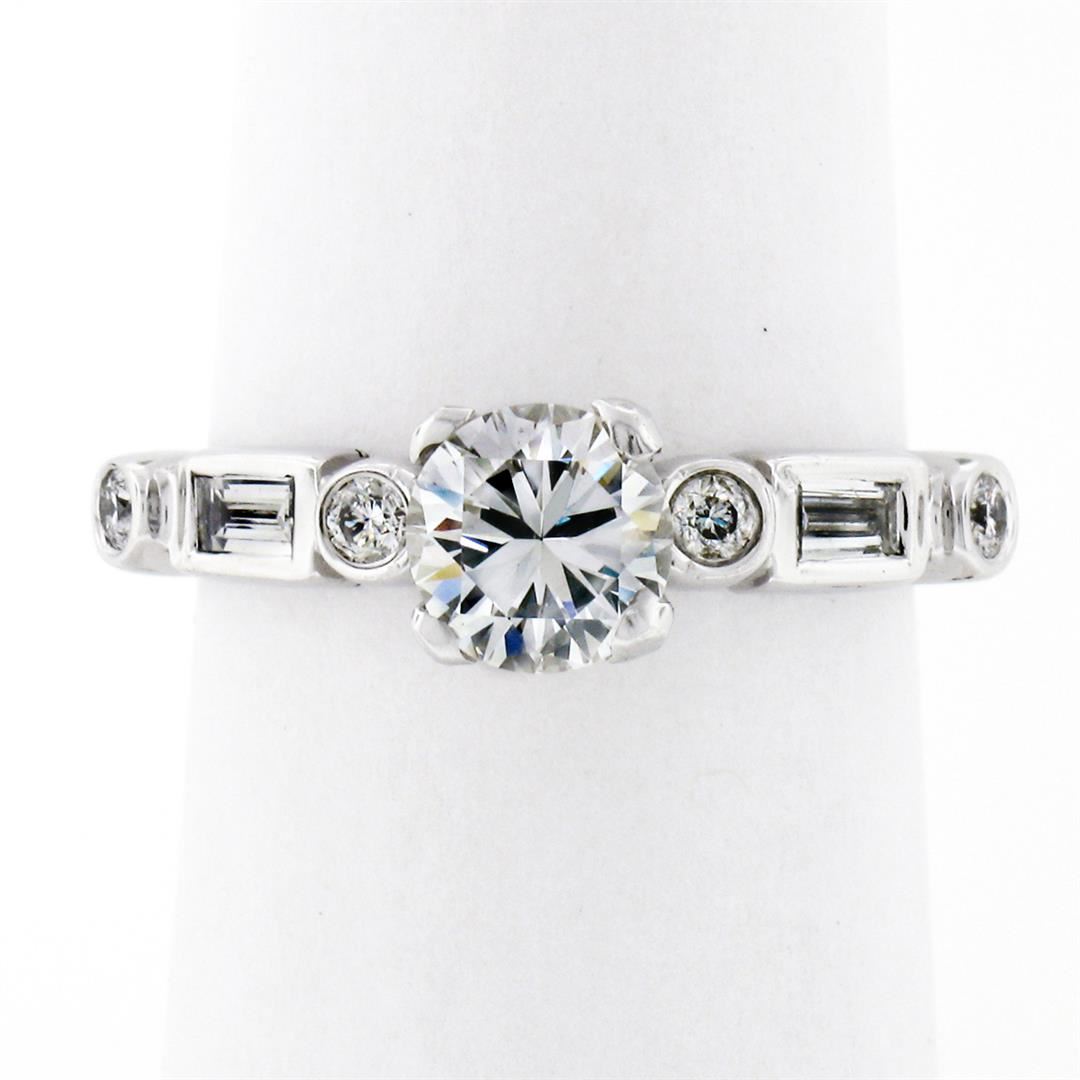 A vintage solid 18k white gold solitaire ring, with 1 round brilliant cut natural diamond (F - VS2 : 0.83ct ), accented with 4 round brilliant cut natural diamonds (F/G - VS2/SI1 ; 0.20ctw), and 2 baguette cut natural diamonds (F/G - VS2; 0.24ctw ). The ring is size 7.0, weighs a total of 4.25 grams, and measures 6.15mm wide.