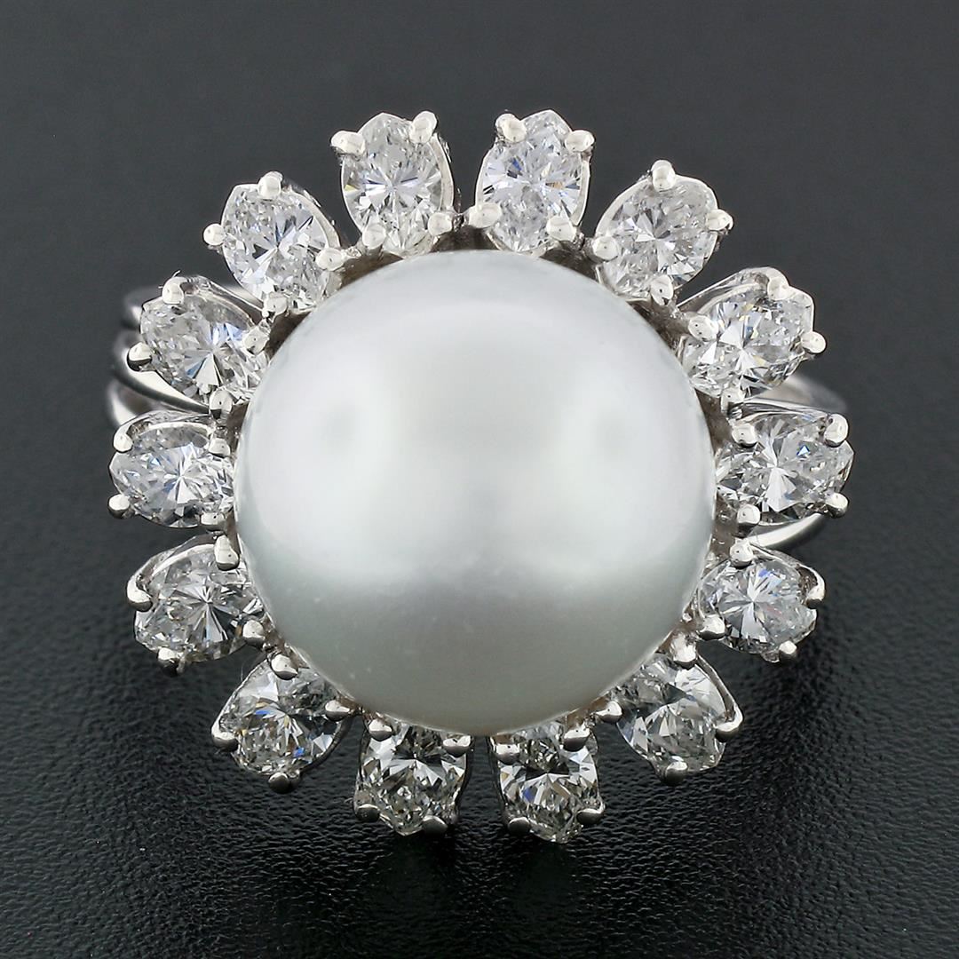 A vintage solid 18k white gold ring, with 1 round shape cultured south sea pearl (12.73mm), surrounded with a halo of 14 wide marquise cut natural diamonds (G/H- VS1/VS2; 2.10ctw). The ring is size 8.5, weighs a total of 11.28 grams, and measures 19.95mm wide.