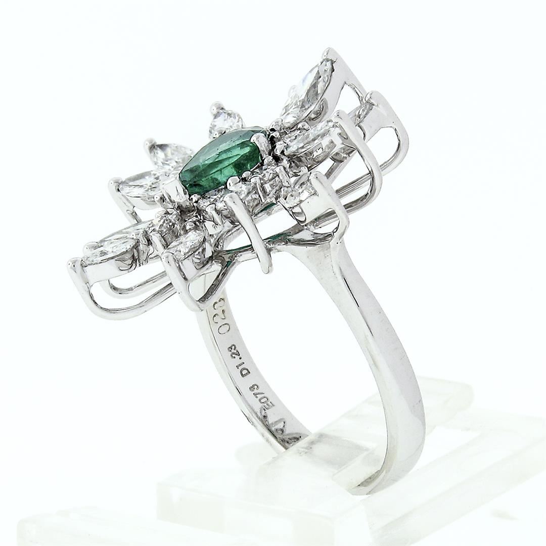 A vintage solid 18k white gold spray cocktail ring, with 1 pear cut natural emerald (6.4x5.0mm - 0.73ct), surrounded with 12 marquise cut natural diamonds (G/H-VS1/VS2 ; 1.23ctw), & 7 round brilliant cut natural diamond (G/H - VS1/VS2 ; 0.28ctw). The ring is size 6.5, weighs a total of 5.37 grams, and measures 22.2mm wide.