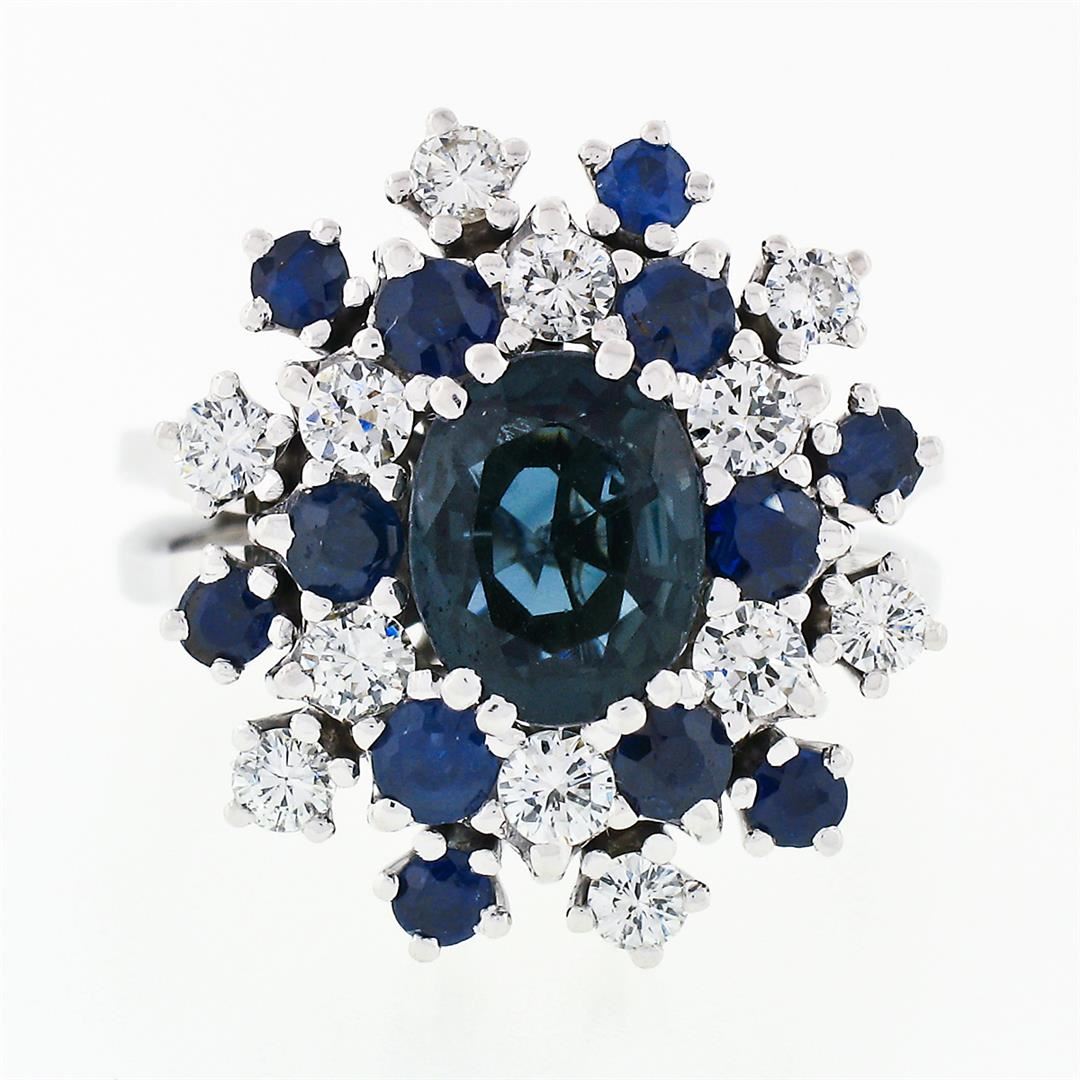 A vintage 18k white gold cocktail ring with 1 oval brilliant cut natural sapphire (1.55ct) surrounded with 12 round cut natural sapphires (1.10ctw) and 12 round brilliant cut natural diamonds (F/G - VS1; 0.50ctw). The ring is size 6.0, weighs a total of 9.44 grams, and measures 18.52mm wide.