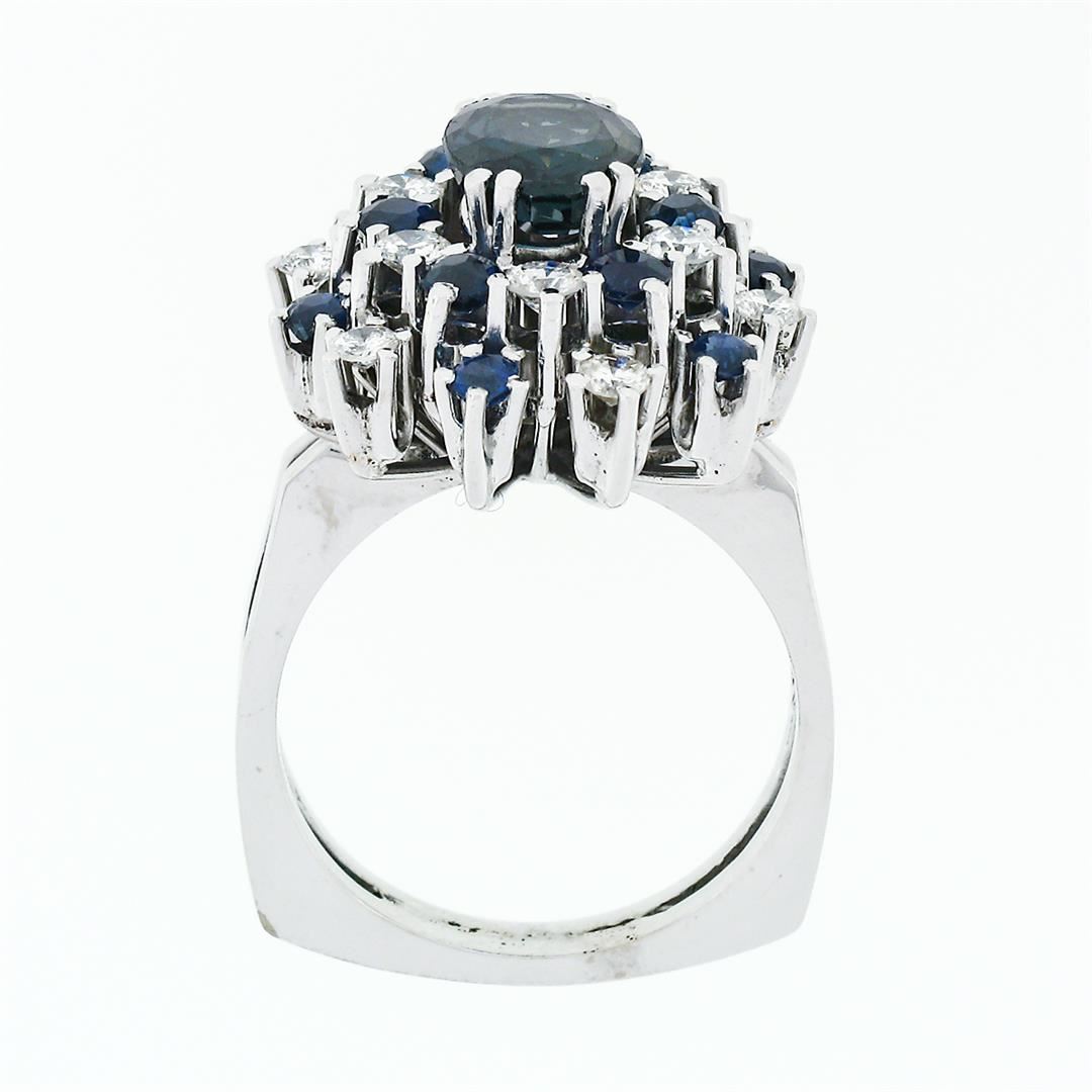 A vintage 18k white gold cocktail ring with 1 oval brilliant cut natural sapphire (1.55ct) surrounded with 12 round cut natural sapphires (1.10ctw) and 12 round brilliant cut natural diamonds (F/G - VS1; 0.50ctw). The ring is size 6.0, weighs a total of 9.44 grams, and measures 18.52mm wide.