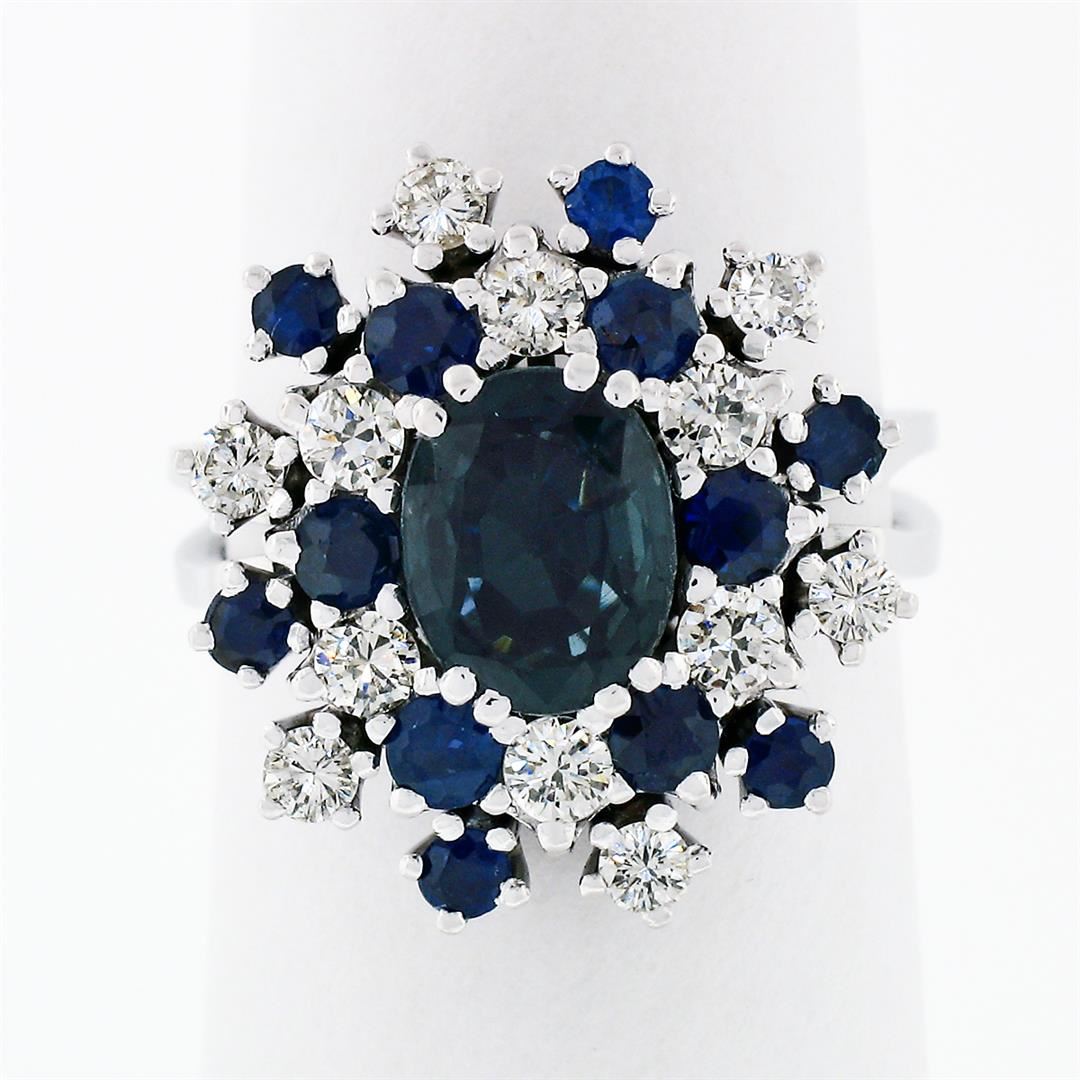 A vintage 18k white gold cocktail ring with 1 oval brilliant cut natural sapphire (1.55ct) surrounded with 12 round cut natural sapphires (1.10ctw) and 12 round brilliant cut natural diamonds (F/G - VS1; 0.50ctw). The ring is size 6.0, weighs a total of 9.44 grams, and measures 18.52mm wide.