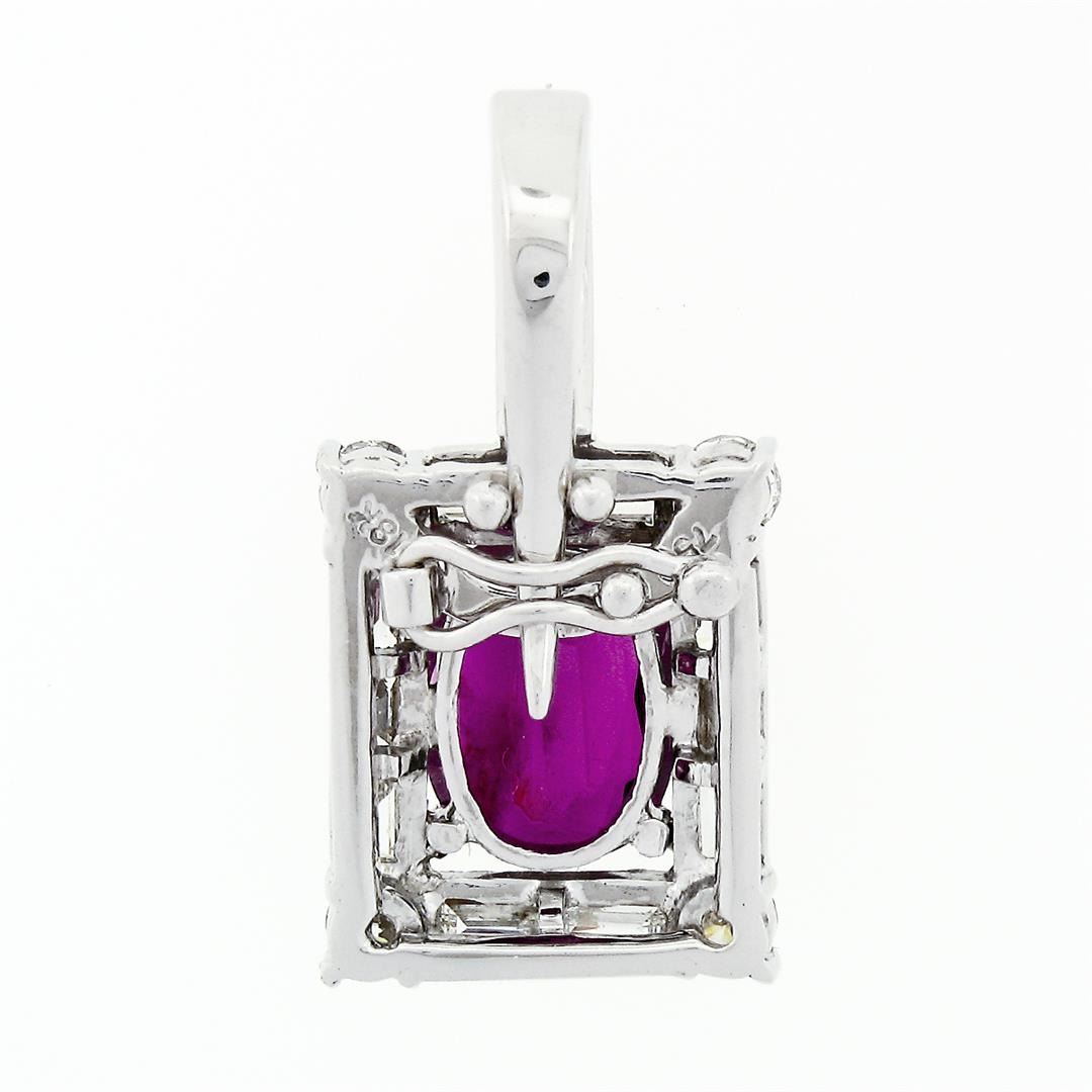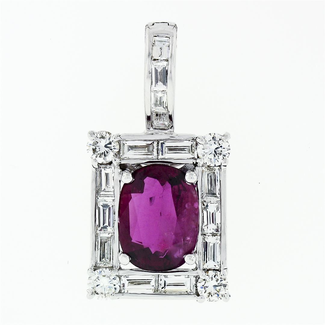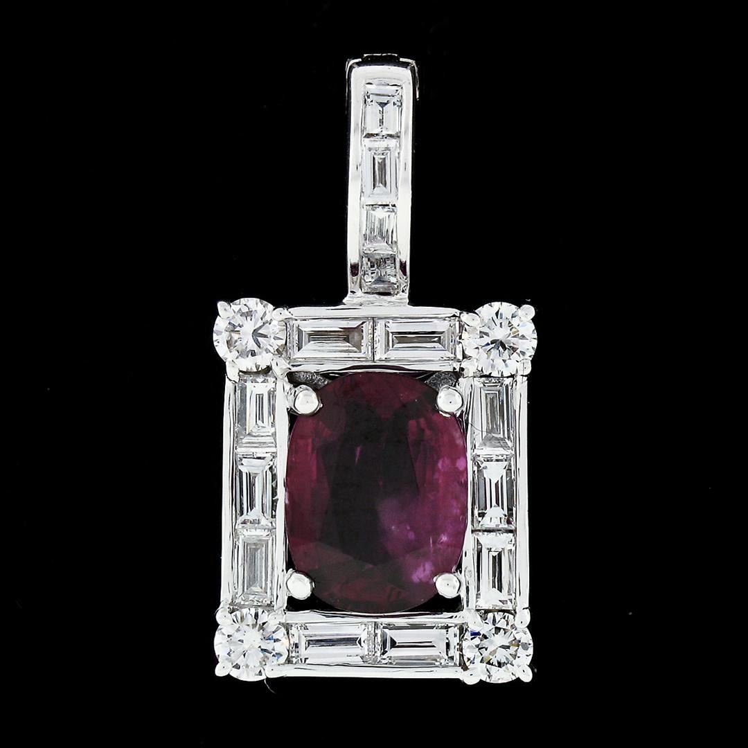 A vintage solid 18k white gold enhancer pendant, with 1 Gia certified oval cut natural ruby (1.83ct ), and 4 round brilliant cut natural diamonds (F/G - VVS2/VS1 ; 0.36ctw), with 16 straight baguette cut natural diamonds (G/H - VVS2/VS1 ; 1.15ctw). The pendant weighs a total of 4.53 grams, measures 24.51x12.64mm including the bail, and the inside of the bail measures 5.4x5.8mm. Comes with all original relevant certifications.