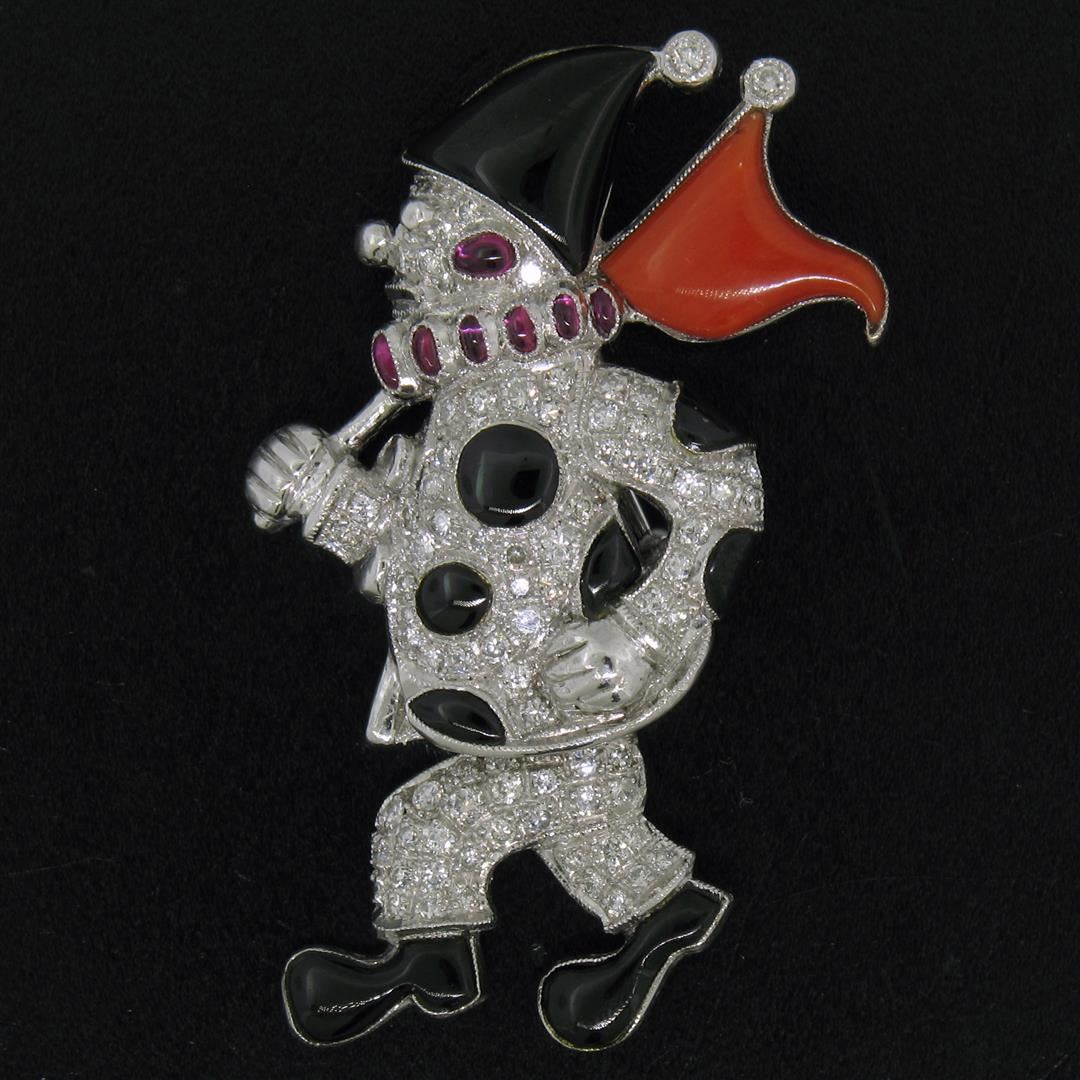 Vintage 18k White Gold Diamond Black Onyx and Coral Clown Brooch Pin